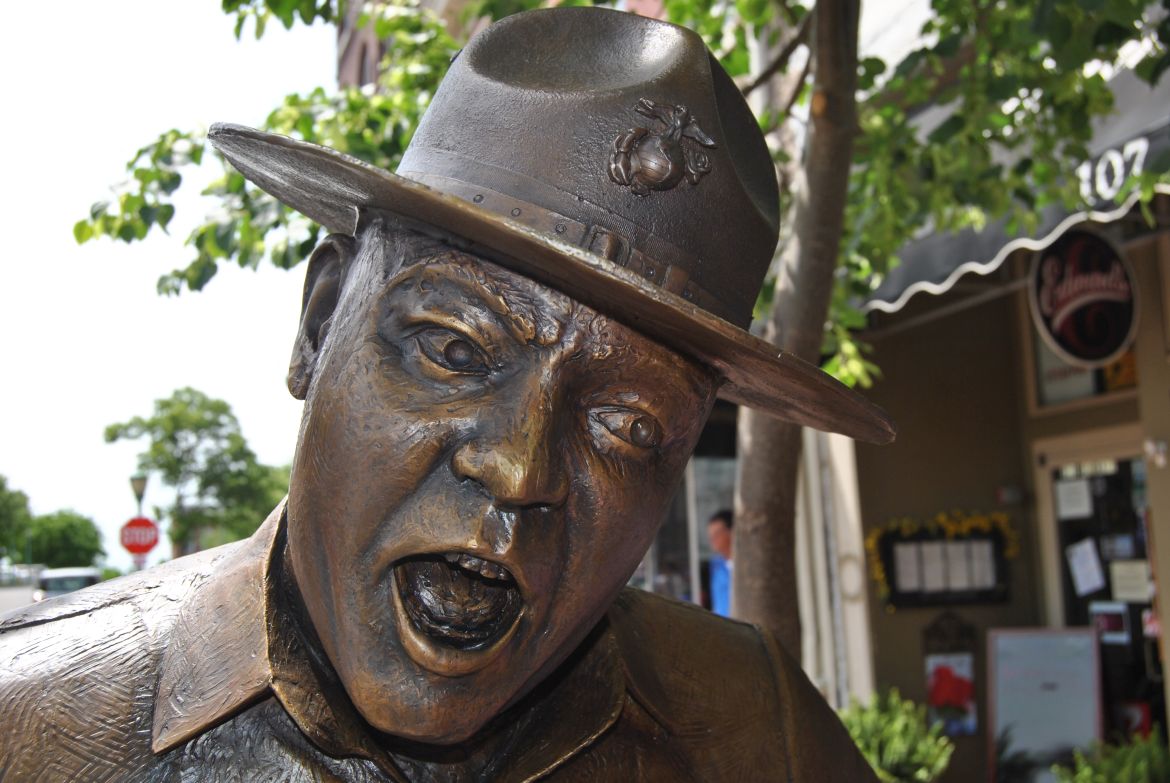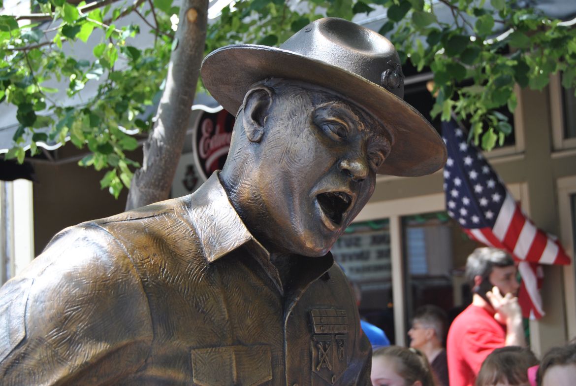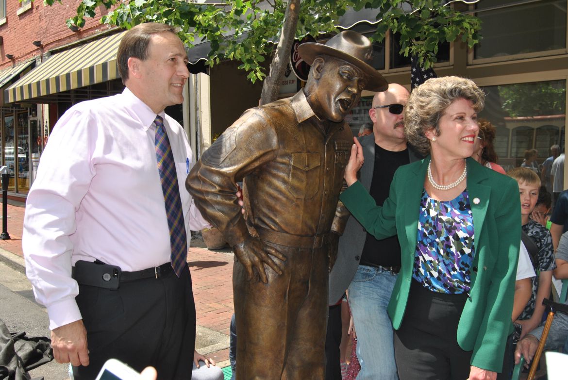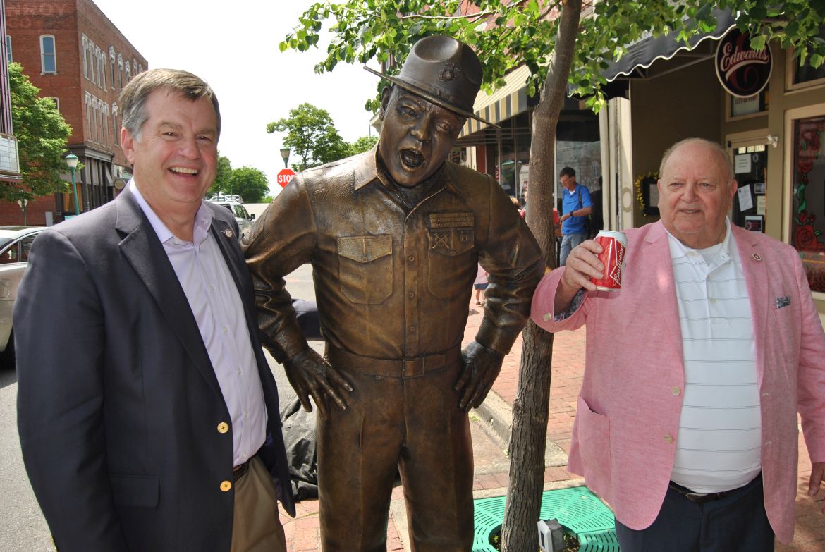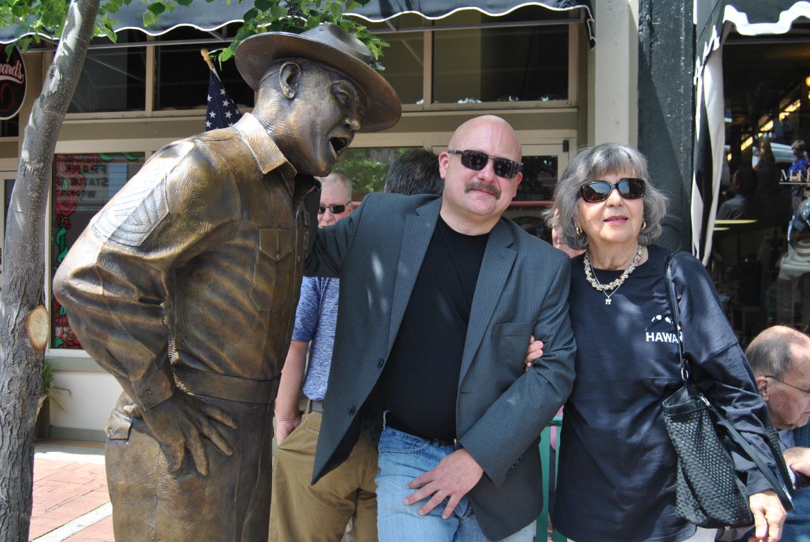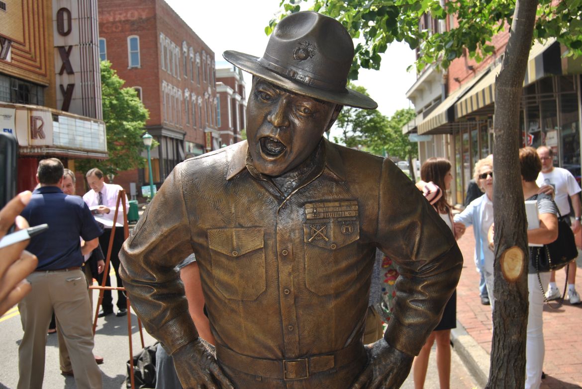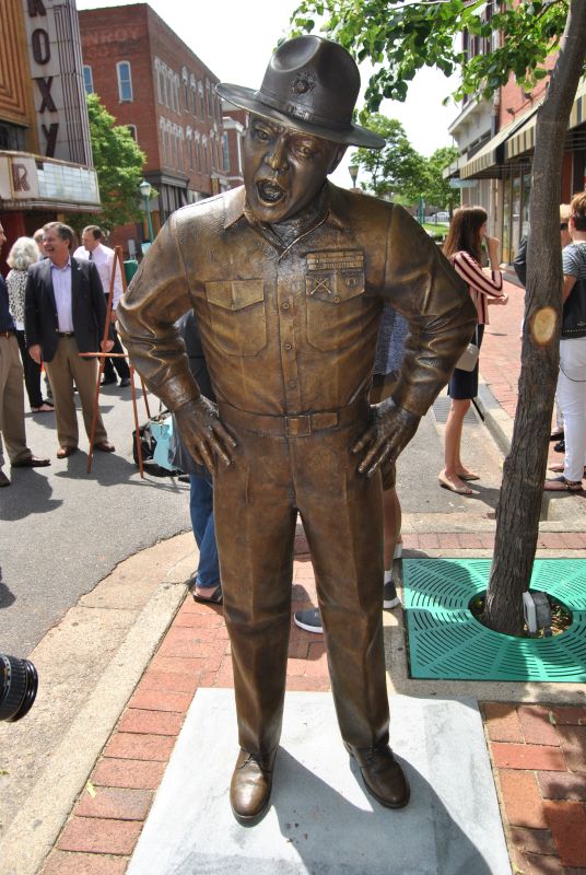 The statue of Sutton emerged glowing in the midday sun and evoked oohs and ahs from the crowd pressing forward from Franklin Street and the sidewalk. Sculptor Wise’s statue perfectly evokes Sutton’s famous “Sgt. Carter” from the CBS sitcom, “Gomer Pyle U.S.M.C.,” with his trademark hat, lean- forward stance, square jaw and flaring nostrils.