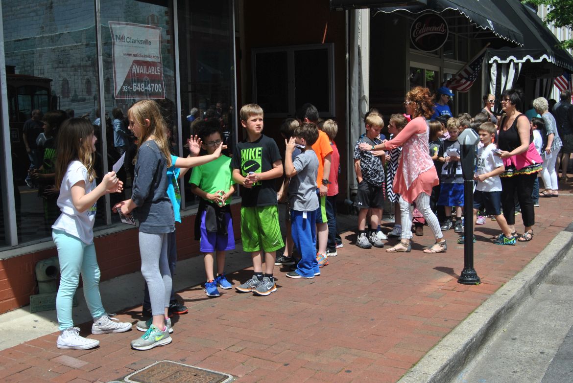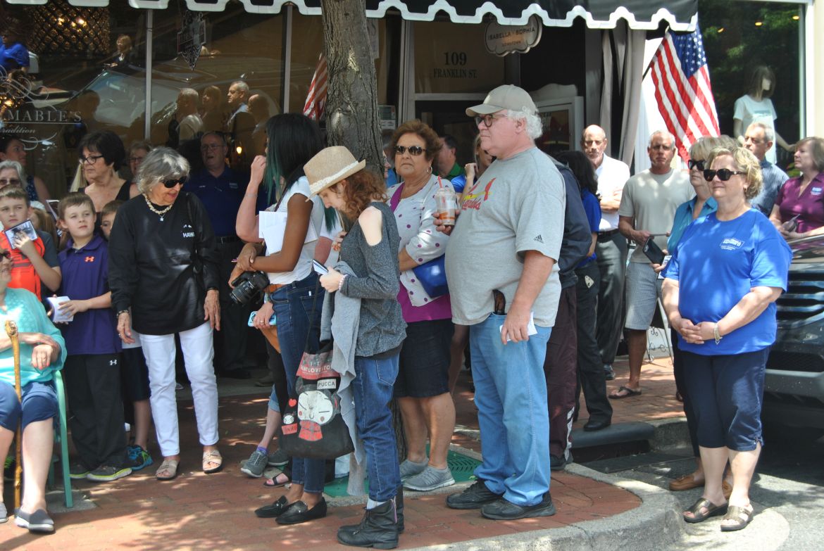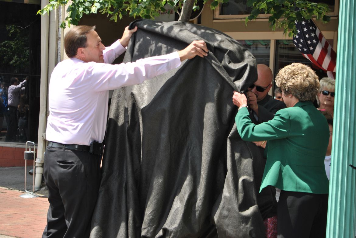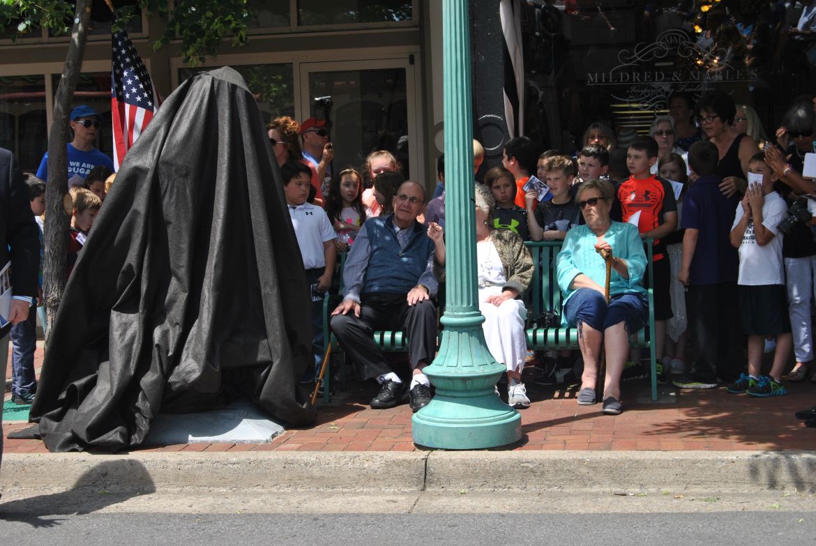 A crowd of more than 150 people — including a large group of third-grade students from Clarksville Academy and a busload of Coldwell Banker Realtors — gathered to watch Mayor Kim McMillan, statue project leader Mark Holleman, and sculptor Scott Wise pull the shroud from the bronze image.
