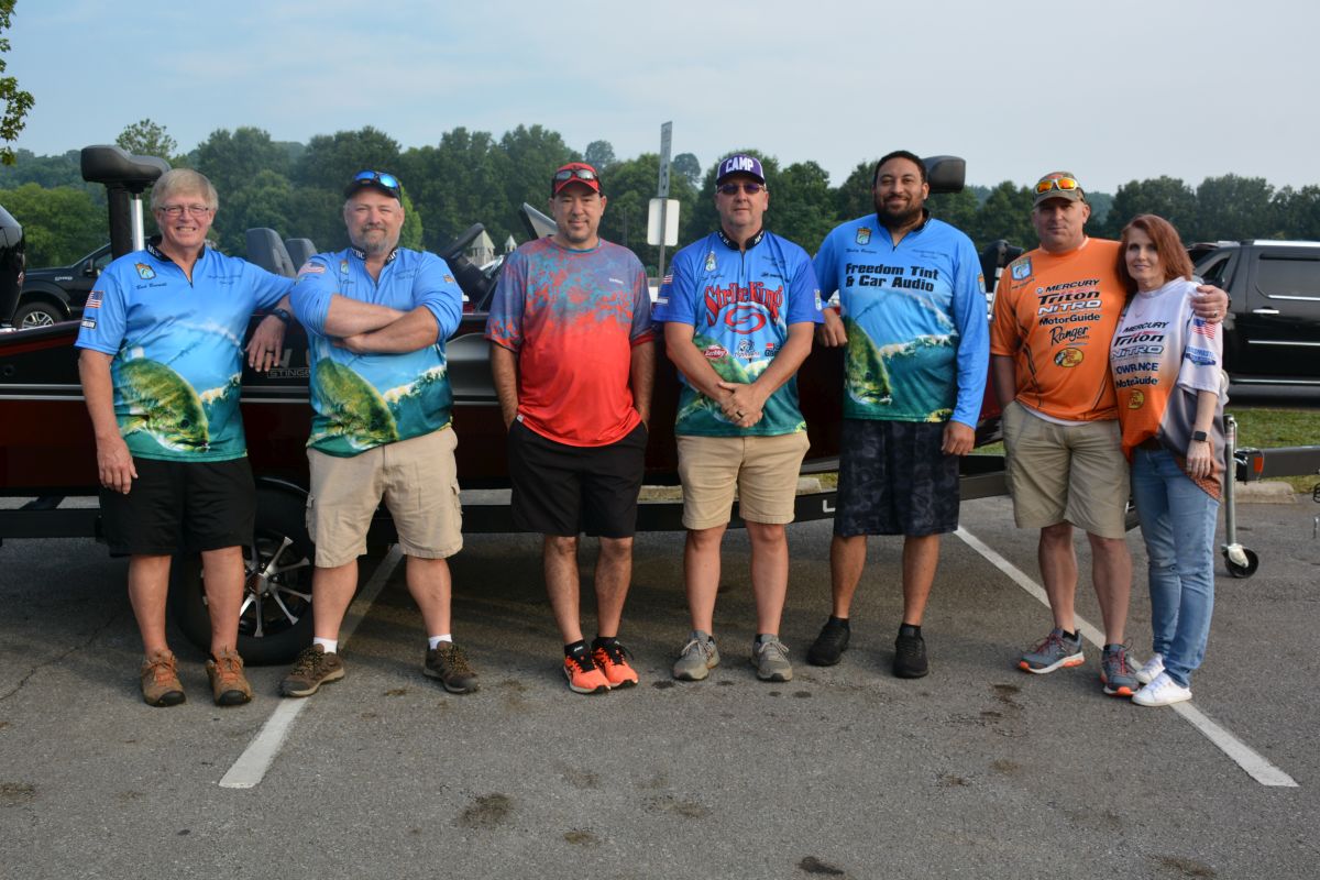 Bud Burnett, Jake Csiszer, Billy Harris, Ken Busbee, Wes Bridges, Robert & Tara Pasionek, members of the Montgomery County Bass Club at the Tennessee Wildlife Resource Agency (TWRA) Youth Fishing Rodeo at the Liberty Park Pond on Jun. 10, 2023. (Lee Erwin)