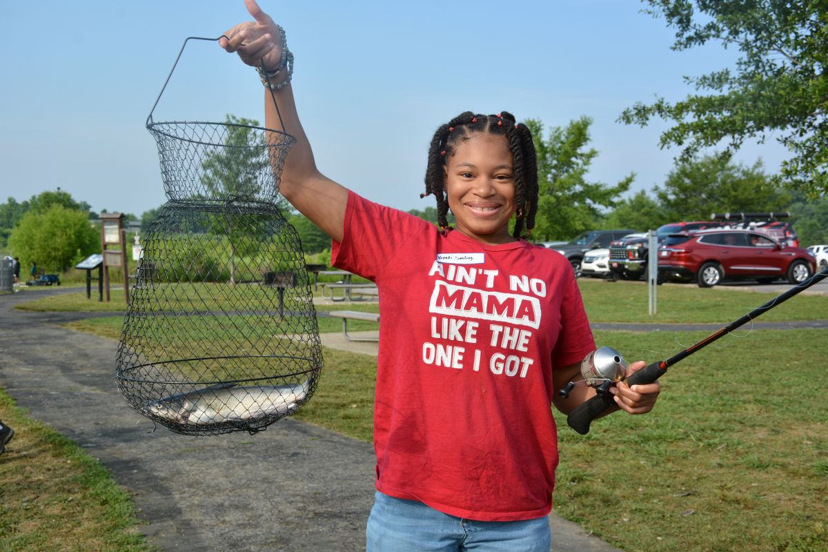 Kenedi Smiling shows off her fish she caught at the Tennessee Wildlife Resource Agency (TWRA) Youth Fishing Rodeo at the Liberty Park Pond on Jun. 10, 2023. (Lee Erwin)