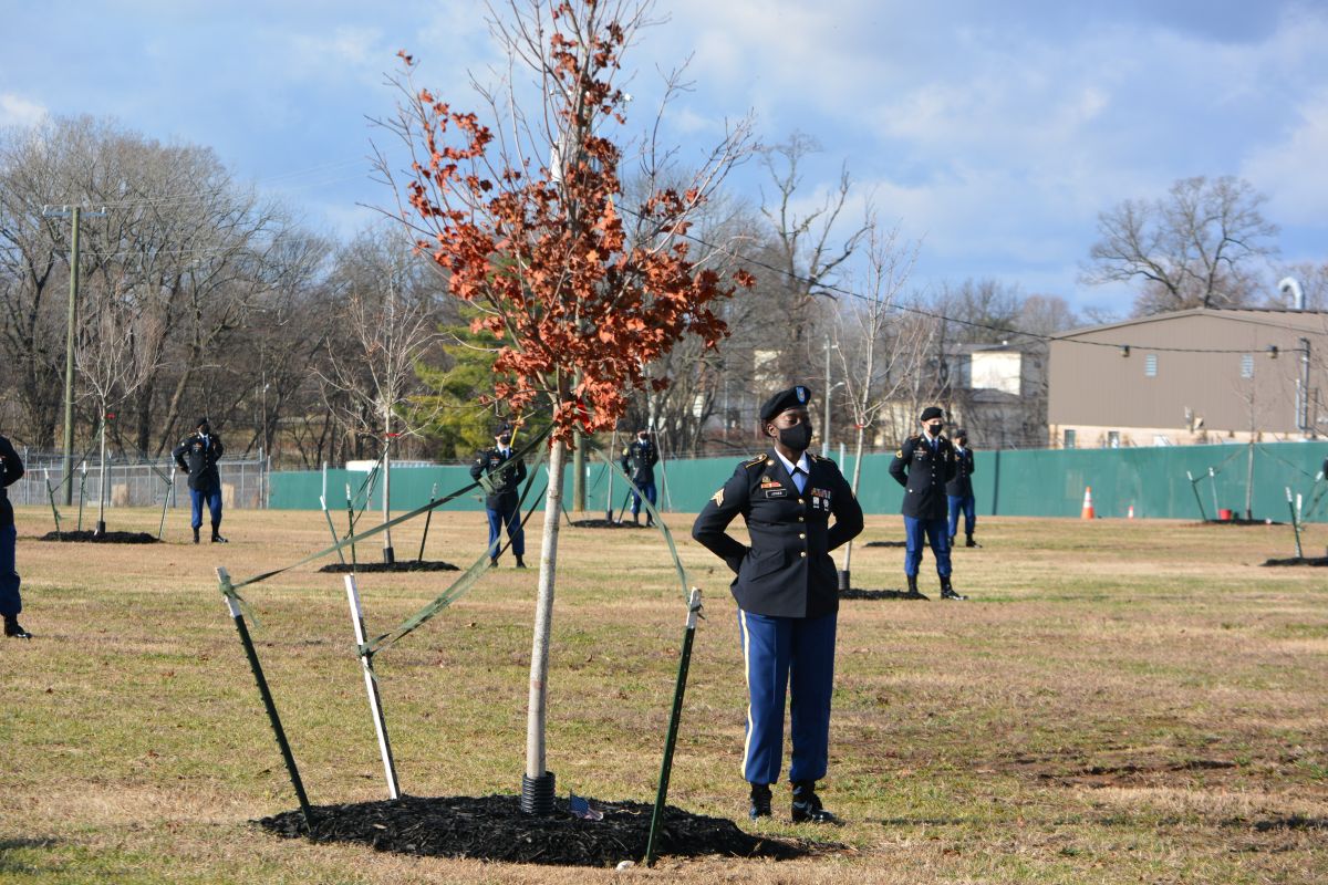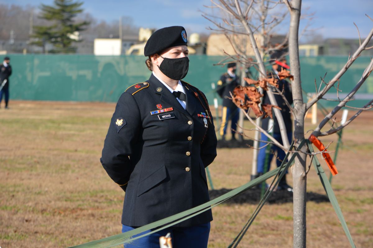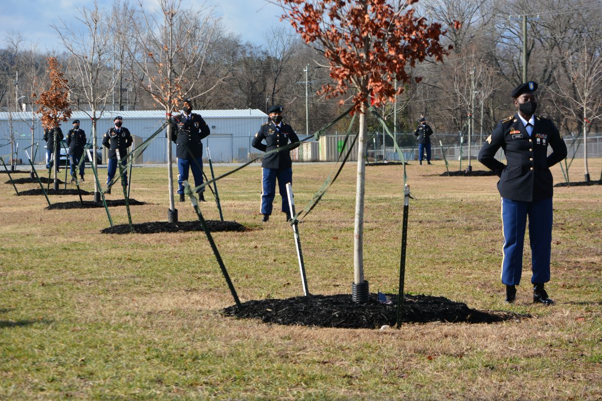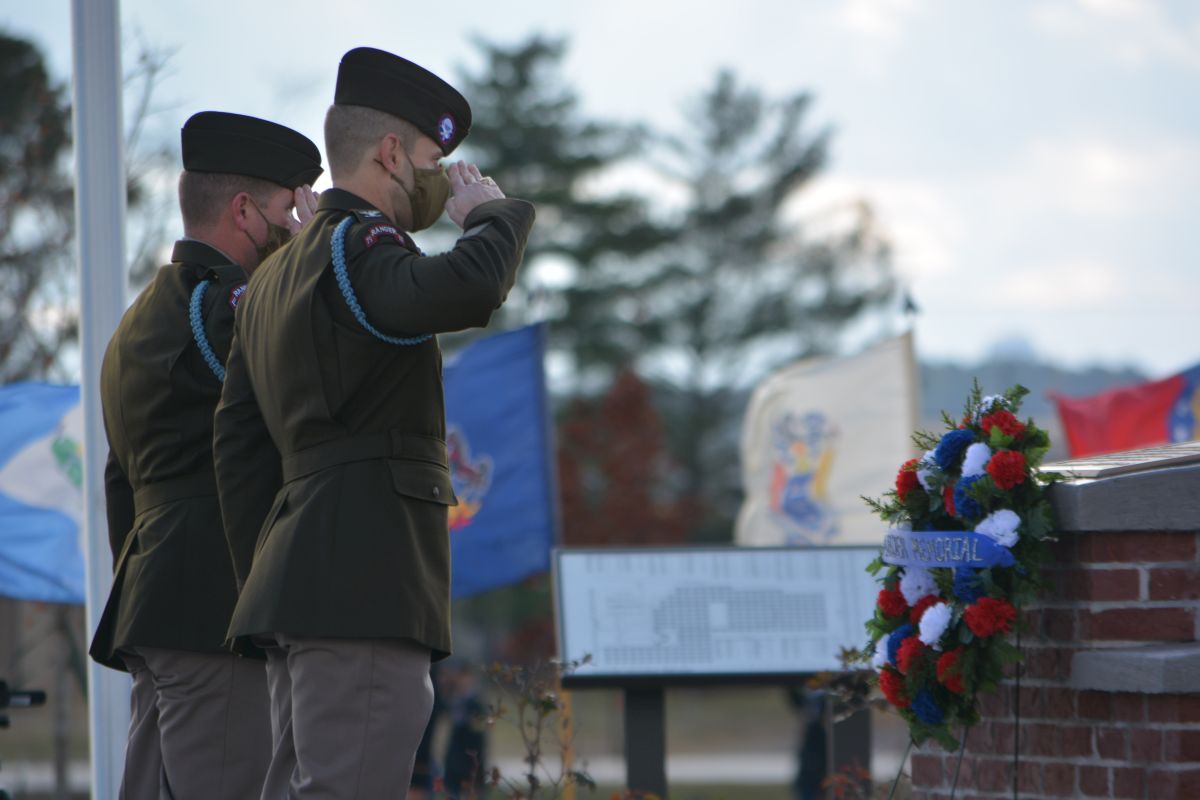 The new memorial at Fort Campbell, which was dedicated last year, has two monuments and 256 Canadian Sugar Maple Trees. A Soldier with the 2nd Brigade stood beside each of the trees during the ceremony which included placing of the Gander Wreath, a moment of silence, a ceremonial firing, and playing of taps.