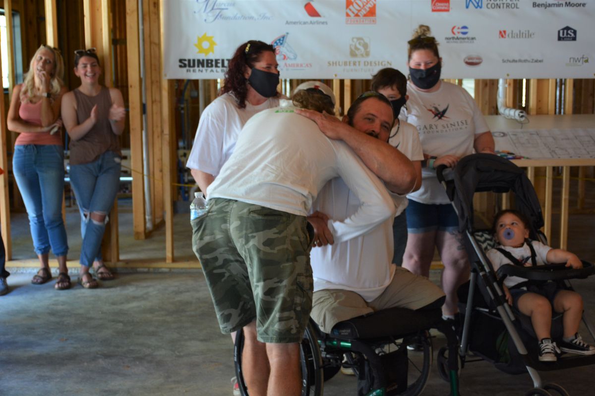 Christopher Kurtz, surrounded by his family. greets local supporters of his specially adapted home being built for the wounded veteran on Thur, September 9 2021 (Lee Erwin).