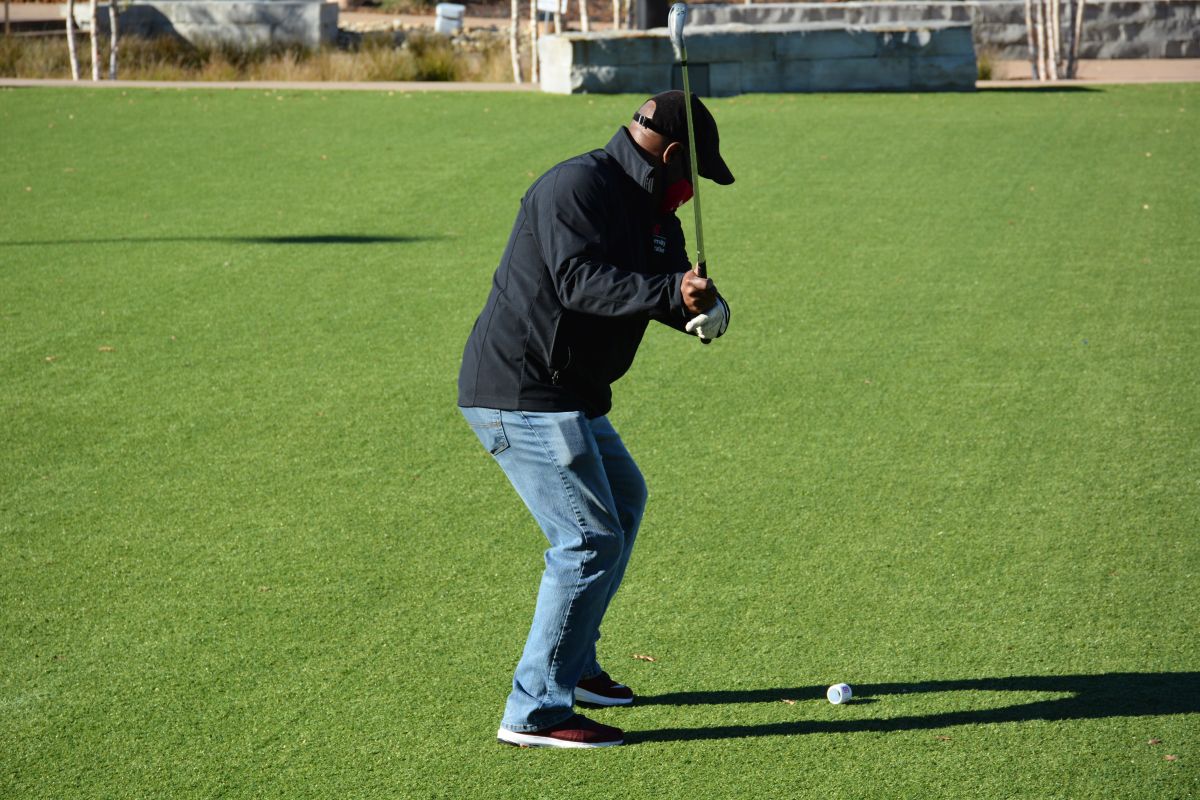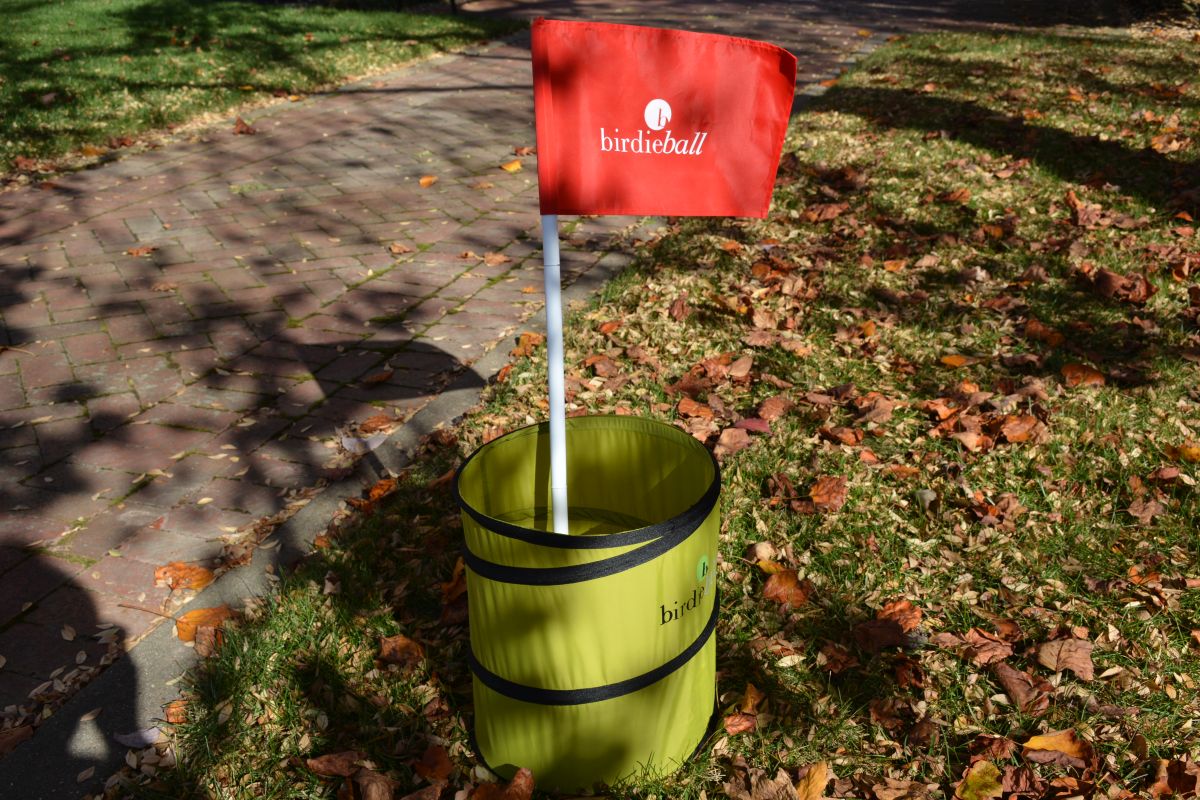 Players do swing a golf club but use what’s known as a Birdie Ball which flies at a slower speed, doesn’t go as far, and bounces harmlessly off objects. The holes were actually bucket looking containers that golfers had to try and get their Birdie Ball close to or into to score.