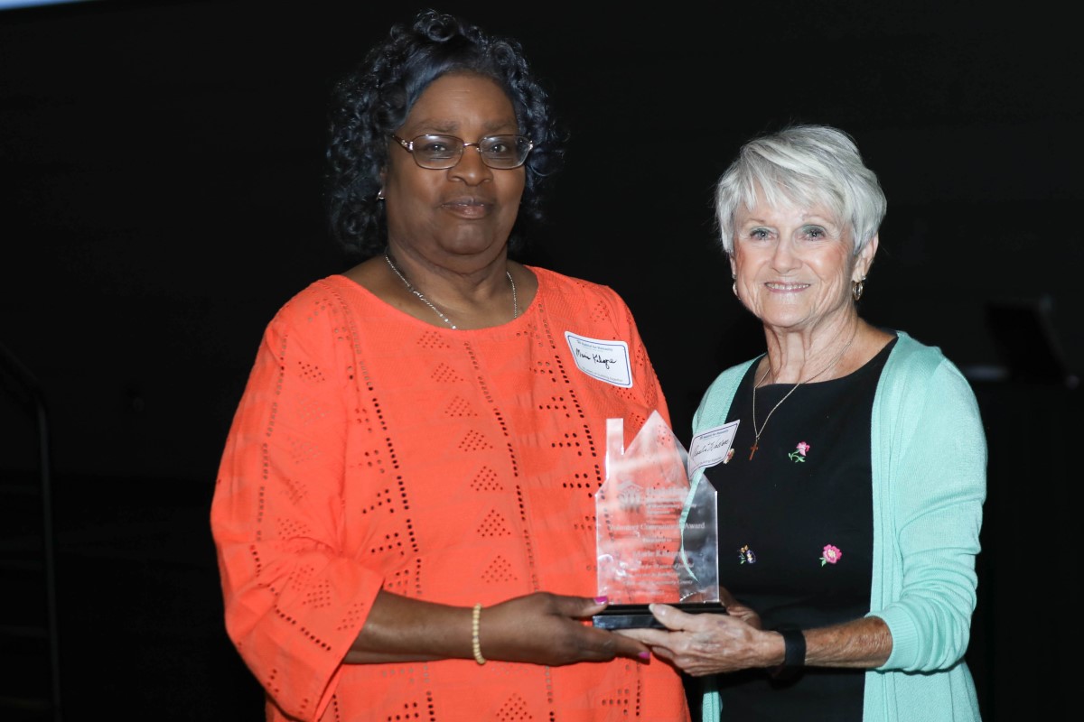 Longtime Habitat for Humanity volunteer Marie Kilgore (left) accepts the Volunteer Appreciation Award from founding Habitat for Humanity MCTN board member Amelia Wallace (right).