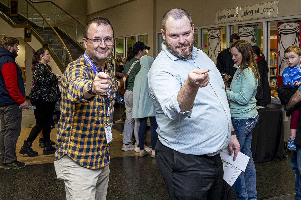 David Brockman and Jason Camp making sure everything goes smoothly at the Harry Potter Night at the CMC Public Library. february 6, 2025 (Jeff Danault)