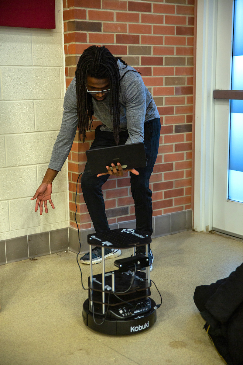 Nicholson hopes that by the end of the semester, the students’ robots will be able to enter an unfamiliar campus building, roam the halls and map the floor plan (much like a human would.