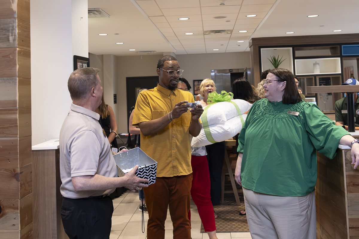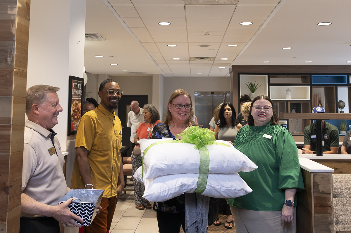 Dawn Betzel wins new pillows at The Clarksville Chamber Business After Hours at the Holiday Inn on June 26, 2025 (Jeff Danault)