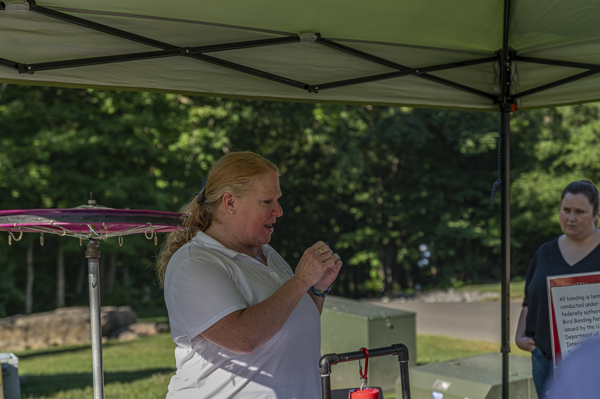 Cyndi Routledge demonstrating the banding process at the 4th Annual Hummingbird Festival. August 17,2024 (Jeff Danault)
