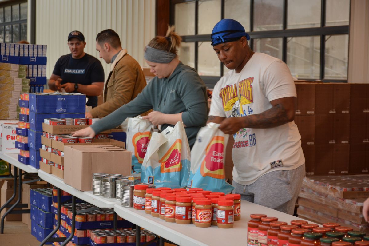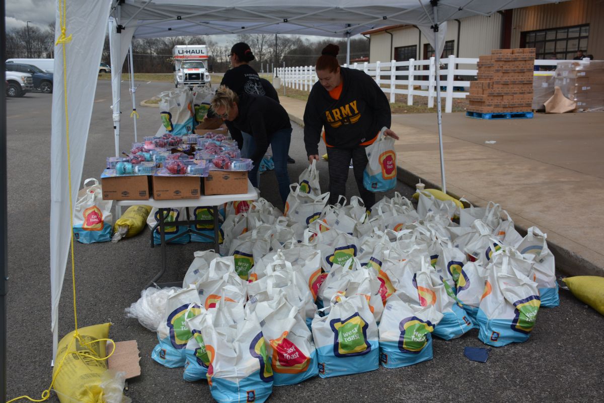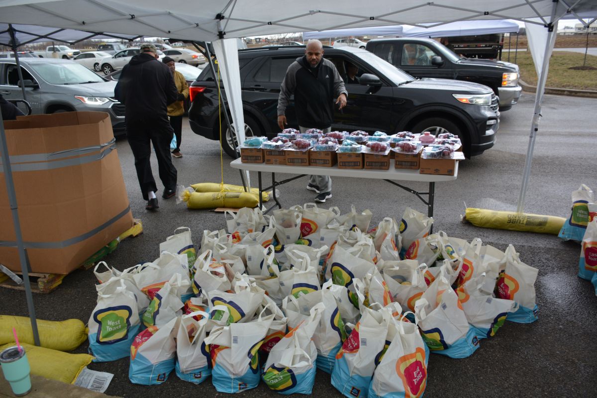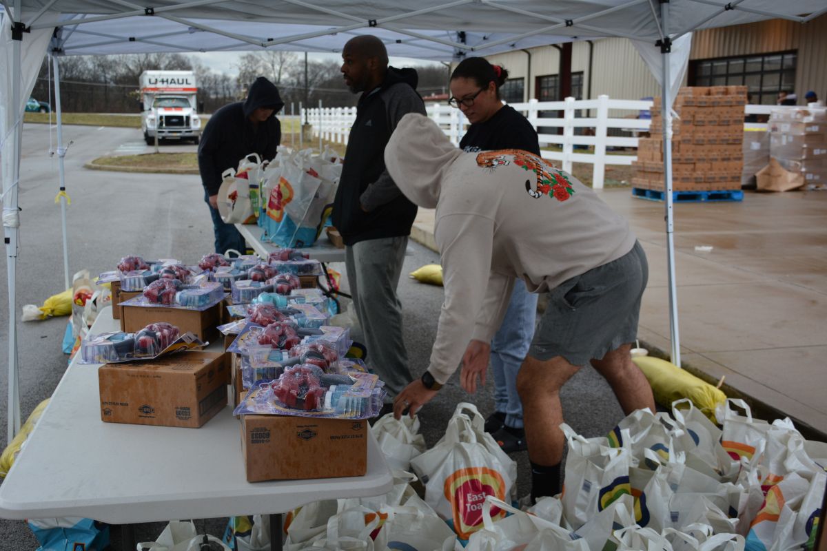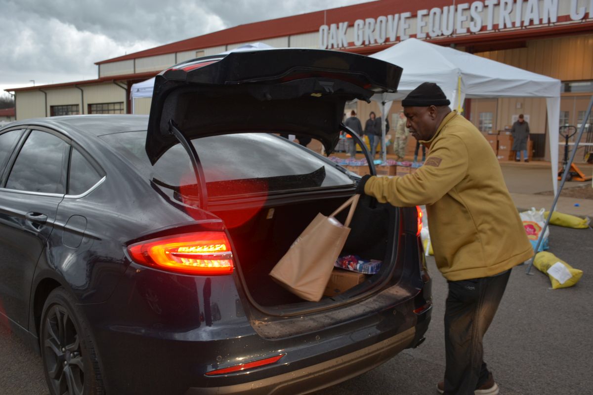 Volunteers with One Generation Away and Fort Care team up to pass out boxes and bags of food at the Oak Grove Equestrian Center to honor service members and their families from Fort Campbell on, Jan.12, 2023. (Lee Erwin).