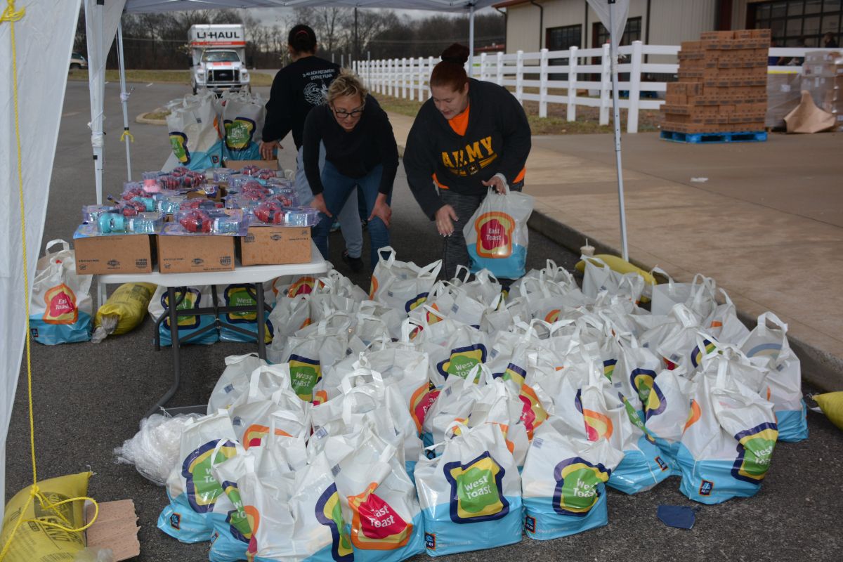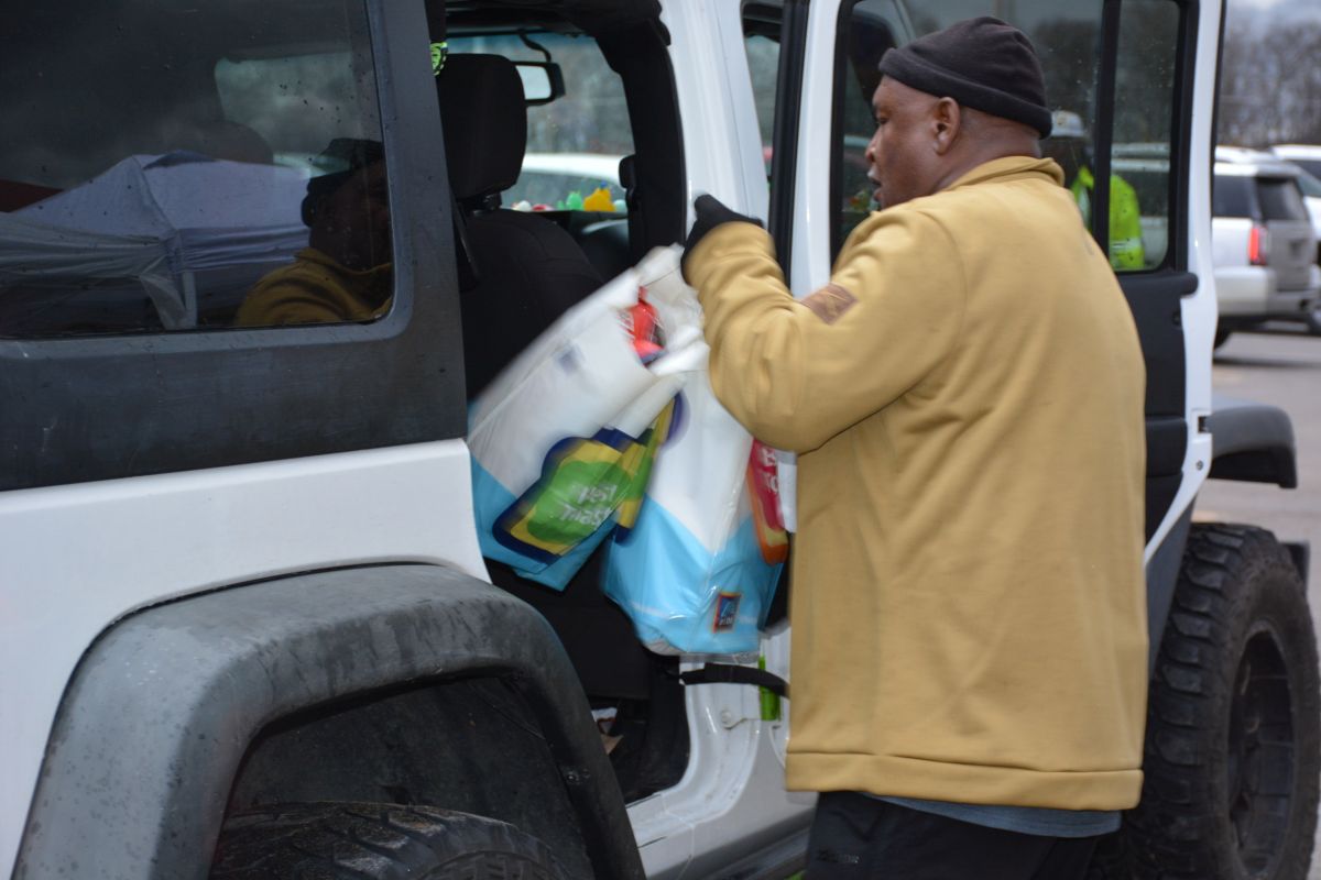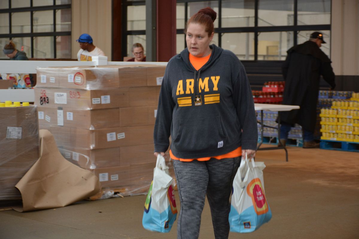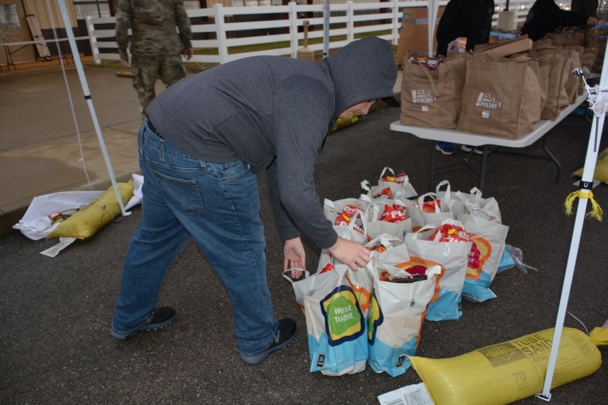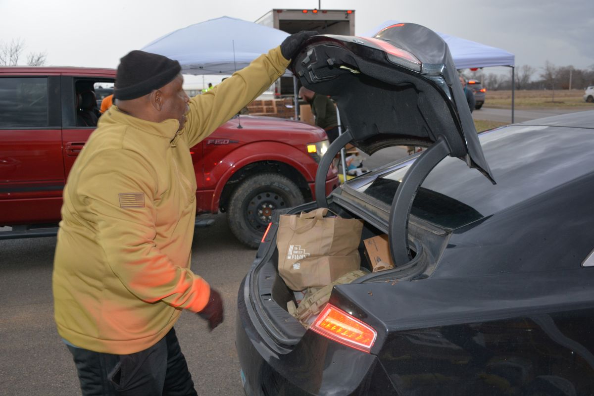 Volunteers with One Generation Away and Fort Care team up to pass out boxes and bags of food at the Oak Grove Equestrian Center to honor service members and their families from Fort Campbell on, Jan.12, 2023. (Lee Erwin).