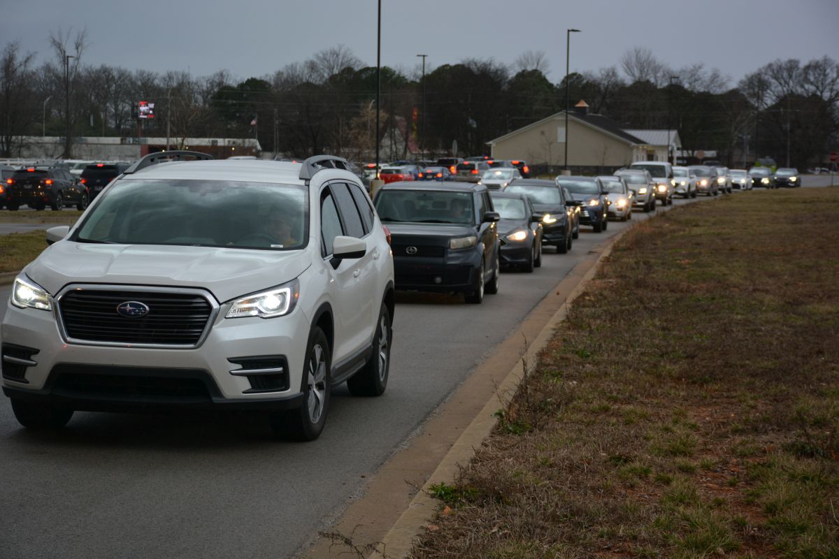 Cars lined up to accept boxes and bags of food from One Generation Away and Fort Care at the Oak Grove Equestrian Center to honor service members and their families from Fort Campbell on, Jan.12, 2023. (Lee Erwin).