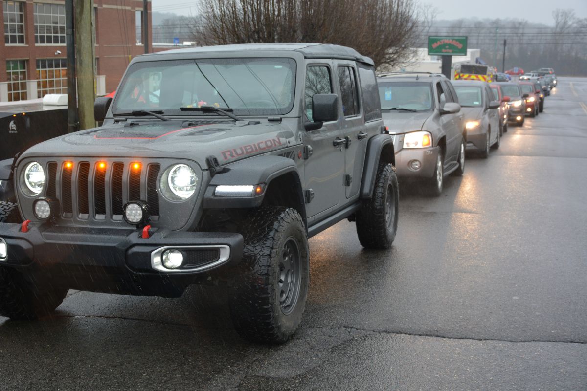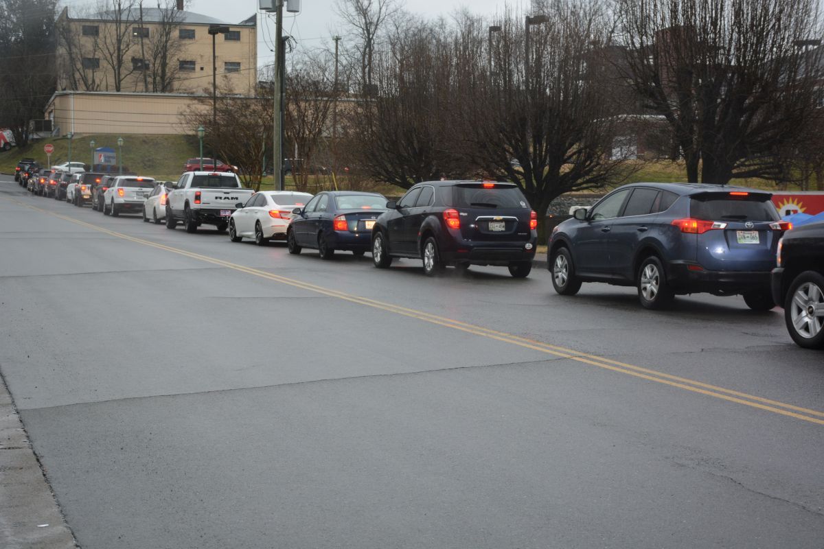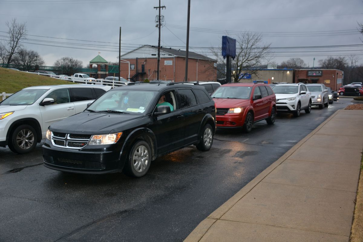 Military and veteran families line up for food and other essentials during the drive-thru event at Operation Honor, on Feb. 2, 2022 (Lee Erwin)