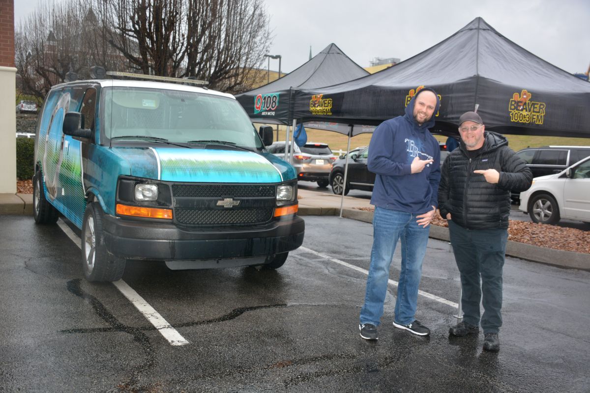 Q108 morning Air Personality Tom Dupree and Beaver Country 100.3 morning Air Personality Fletch, broadcast from the drive-thru event for military and veteran families at Operation Honor, on Feb. 2, 2022 (Lee Erwin)