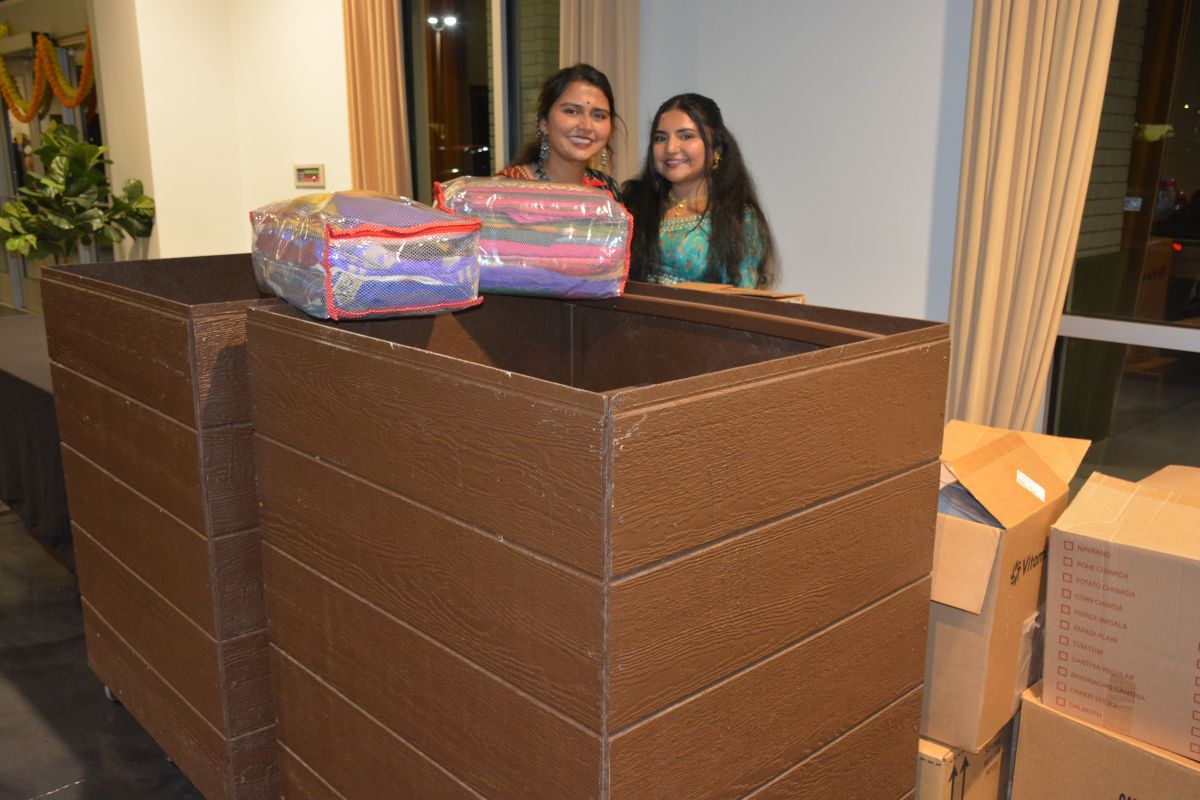 Keya & Jeal Patel stand behind the boxes of clothing donated by those attending the Navratri Hindu festival celebrated in honor of divine femininity at The Emerald in Clarksville on Oct. 13, 2023. (Lee Erwin)