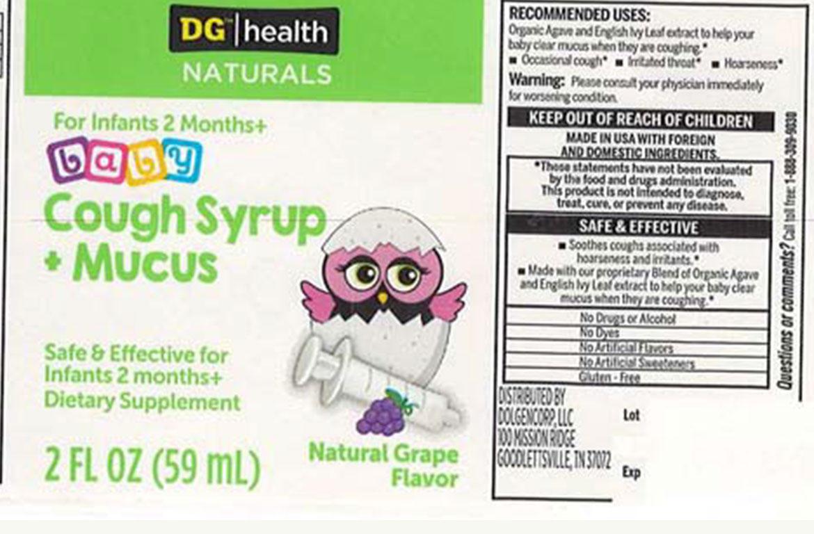 The product comes in a carton labeled DG™/health baby Cough Syrup + Mucus in 2-fluid ounce bottles marked with Lot KL180157 Expiration date 11/20 on the bottom of the carton and back of the bottle label; UPC Code 8 54954 00250 0.