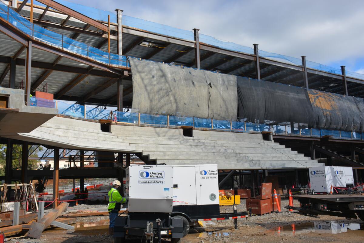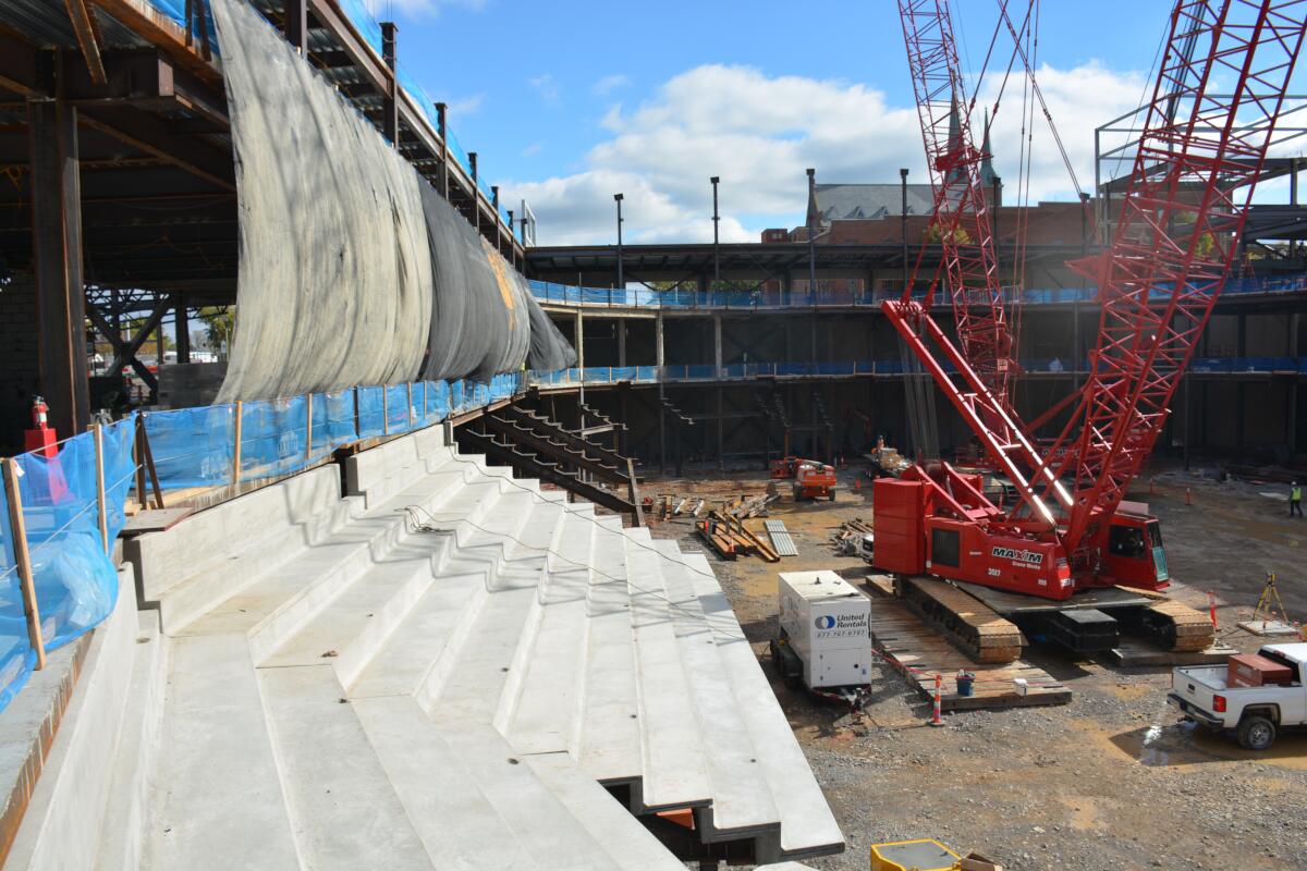 Fixed seating has already begun going in at F&M Bank Arena, with retractable seating set to go in below it on Oct. 26, 2021. (Casey Williams)