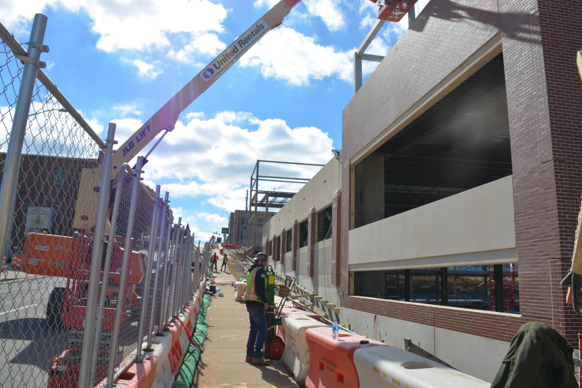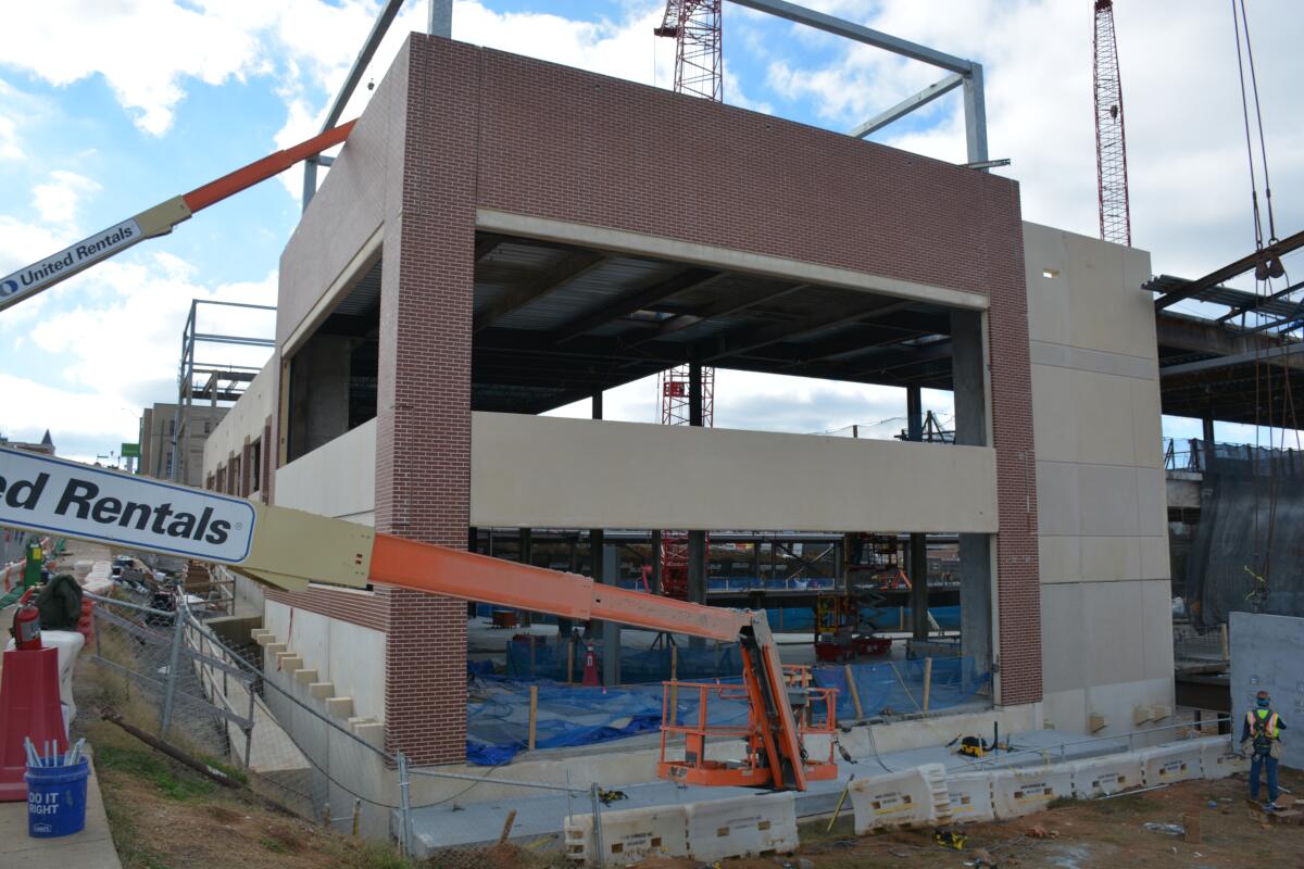 The eastern wall of F&M Bank Arena in the process of being bricked on Oct. 26, 2021. (Casey Williams)