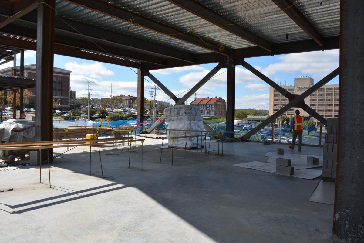 A northwestern portion of the F&M Bank Arena’s concourse area will include a biergarten-style bar, which will be located approximately where the 2×4’s are, shown on Oct. 26, 2021. (Casey Williams)