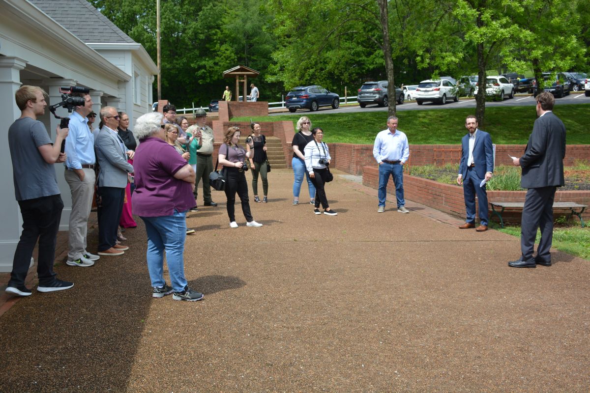 Local state officials gather at the unveiling of the Tennessee Music Pathways marker installed at Dunbar Cave State Park in Clarksville on May 6, 2022. (Lee Erwin)