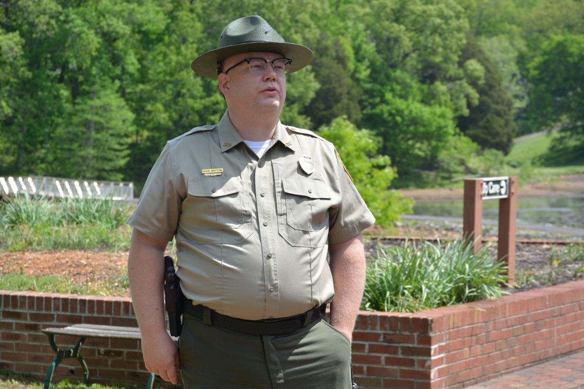 Dunbar Cave Park Ranger David Britton at the unveiling of the Tennessee Music Pathways marker installed at Dunbar Cave State Park in Clarksville on May 6, 2022. (Lee Erwin)