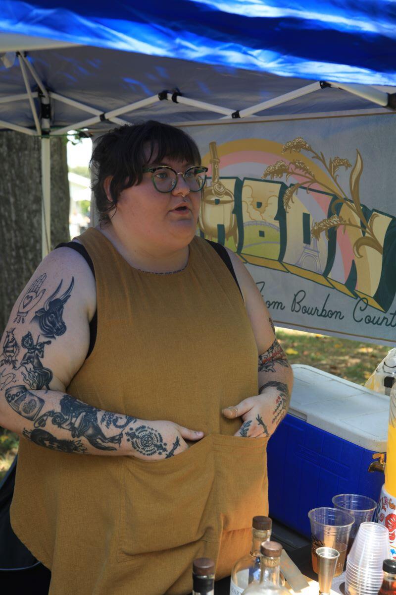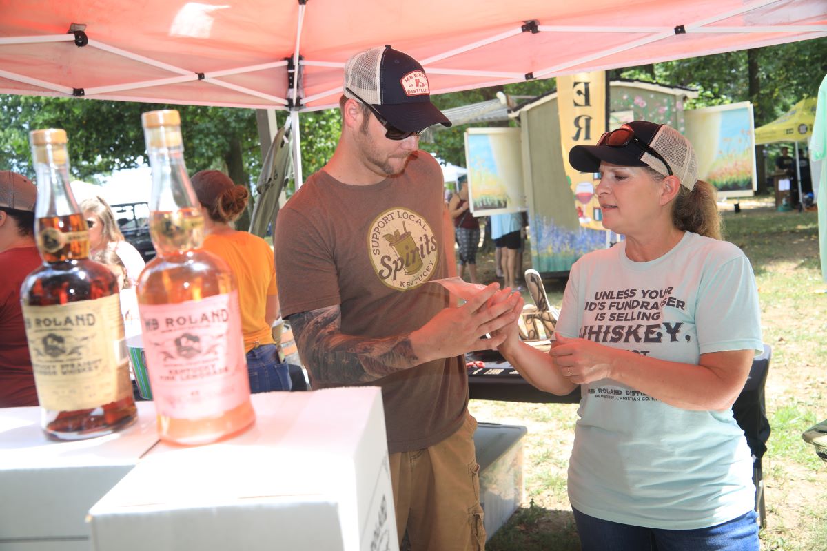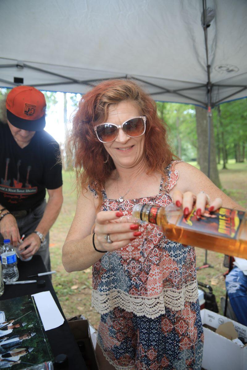 Jennifer Humphrey pouring up samples of Silent Brigade Distillery’s Apple Sin at Oak Grove’s first Kentucky Bands, Bourbon & Wine Festival on Saturday, July 22 2023. (Tony Centonze)