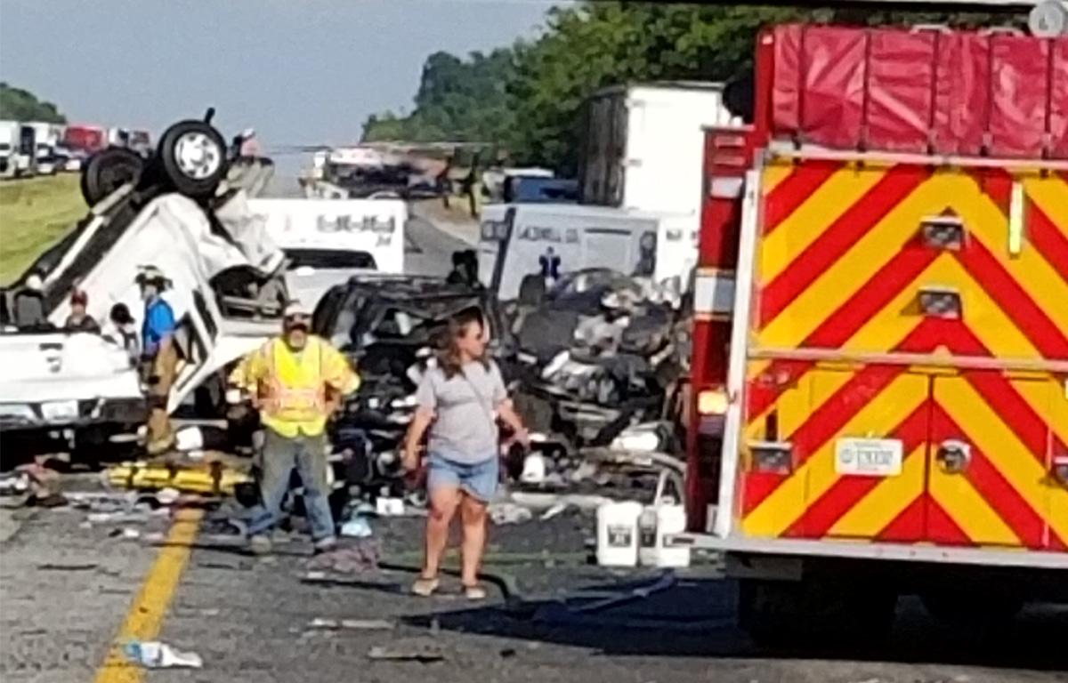 The semi-truck collided with the church van causing the chain of events that left multiple injuries. Eye witness accounts saw the 18-wheeler, van, at least one car, and two motorcycles involved. Approximately 22 people appear to be involved.