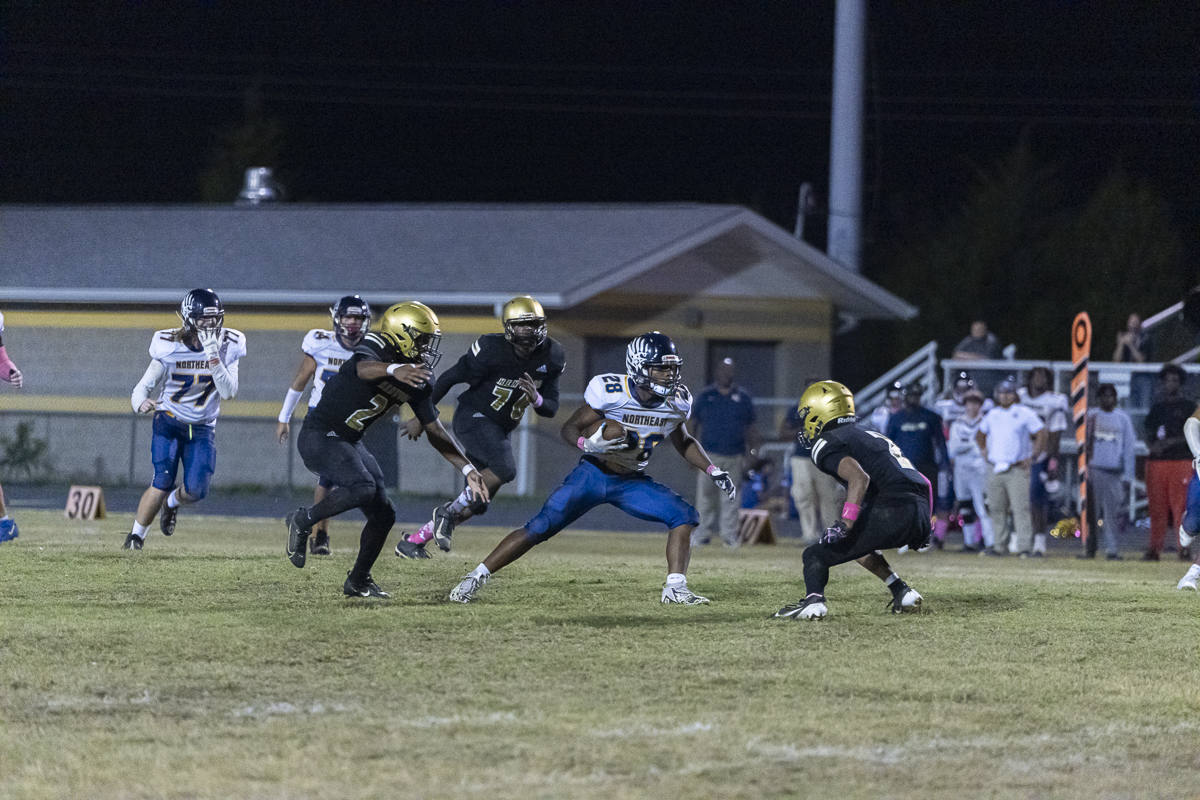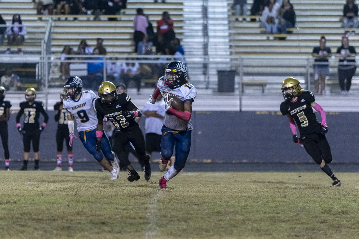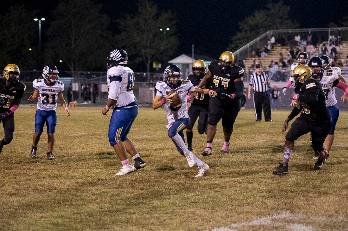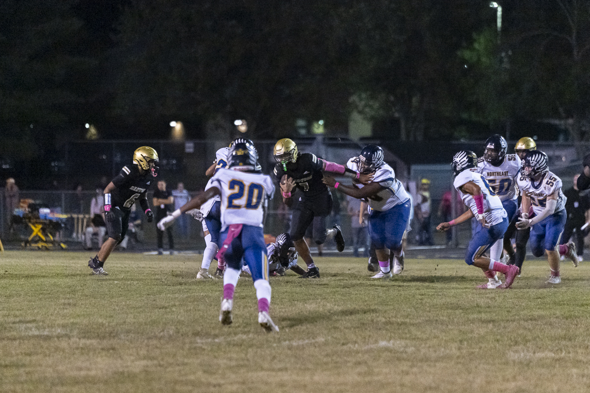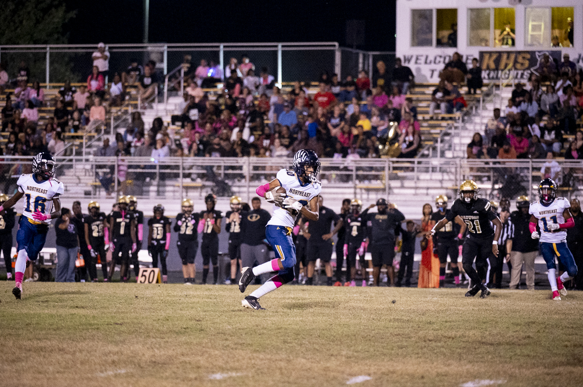 Early on, Kenwood went to the air, with quarterback Jacoby Cox connecting with receiver Jayde Davis on a deep ball for the night’s first score. Cox ran one in himself to add to the lead, and the Knights tacked on one more before the half after Northeast got on the board, making it 18-6 at the break.