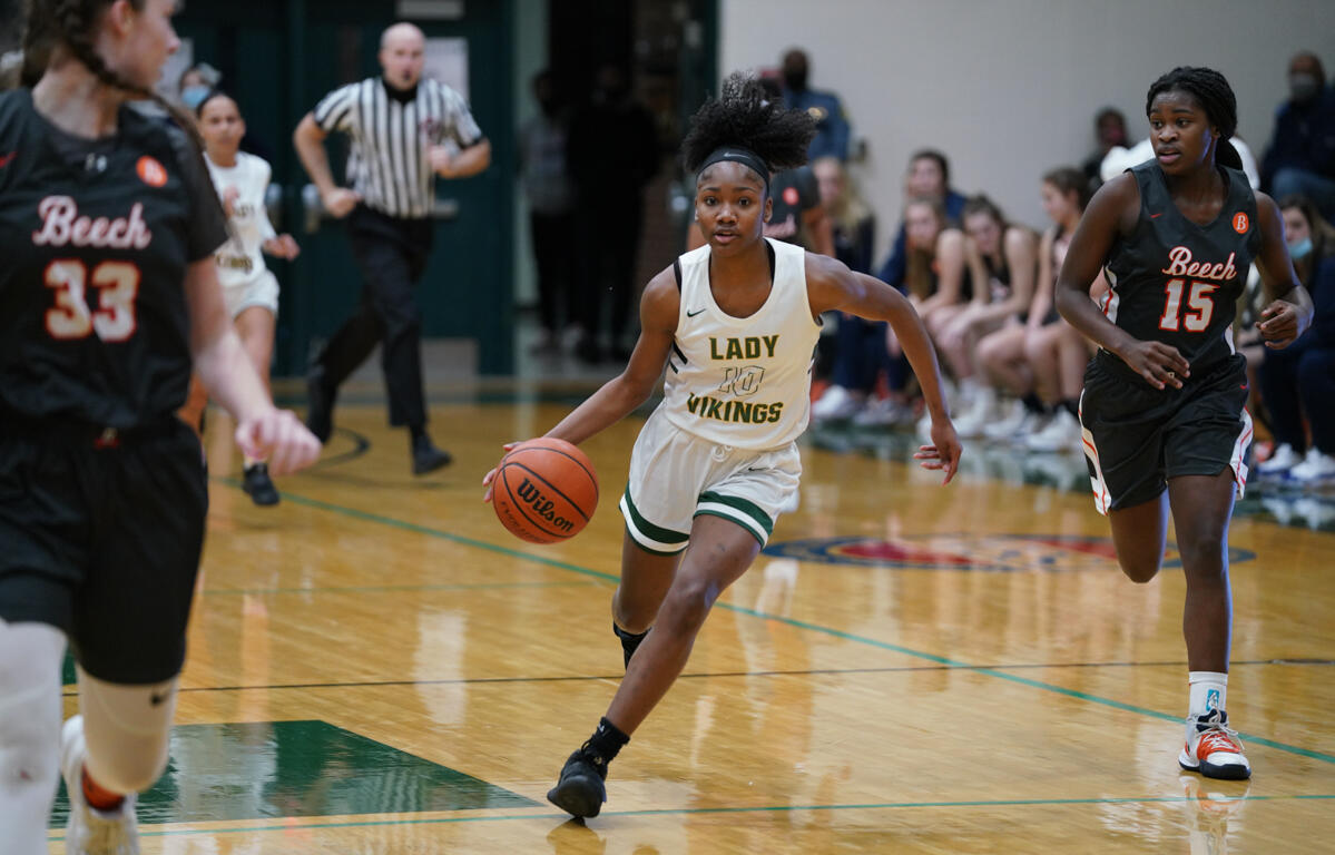 On the final possession of the second quarter, sophomore Emiyah Cobb connected on a deep three-pointer to give the Lady Vikings a four-point advantage at the break.