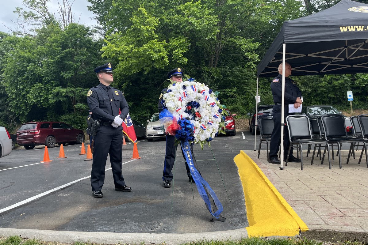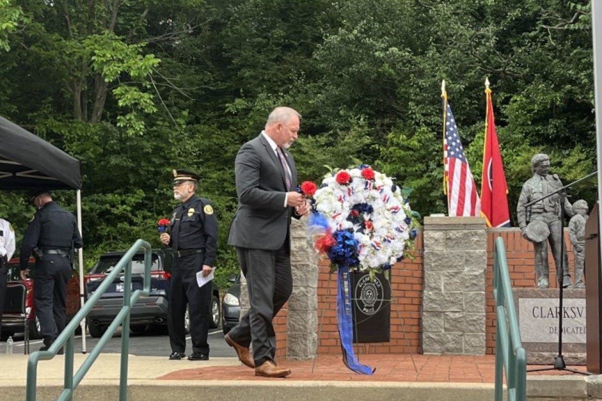 The memorial began with the Pledge of Allegiance led by CPD Deputy Chief Ty Burdine, and a presentation of colors by CPD and MCSO honor guards. The memorial also featured a performance of the national anthem, some guest remarks and lastly the laying of a wreath. Four flowers were placed in the wreath to represent law enforcement officers who lost their lives in Clarksville-Montgomery County, in Tennessee, across the nation and in the military.