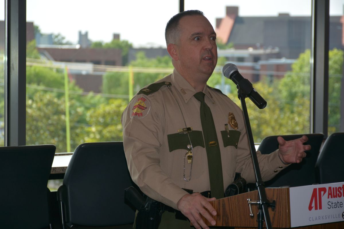 Captain Chris Dye with the Tennessee Highway Patrol speaking at the Hands Across the Border law enforcement safety event at Austin Peay on May 26, 2023. (Lee Erwin)