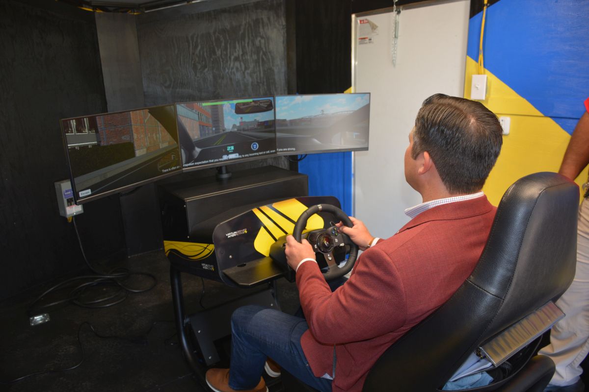 Montgomery County Mayor Wes Golden takes the wheel of the Driving Simulator at the Hands Across the Border law enforcement safety event at Austin Peay on May 26, 2023. (Lee Erwin)