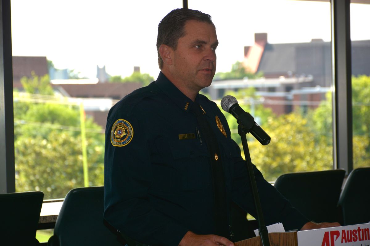Deputy Chief Ty Burdine with the Clarksville Police Department speaking at the Hands Across the Border law enforcement safety event at Austin Peay on May 26, 2023. (Lee Erwin)