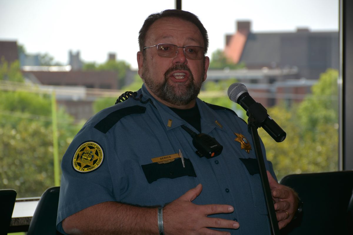 Lt. James Derico with the Montgomery County Sheriff’s Office speaking at the Hands Across the Border law enforcement safety event at Austin Peay on May 26, 2023. (Lee Erwin)