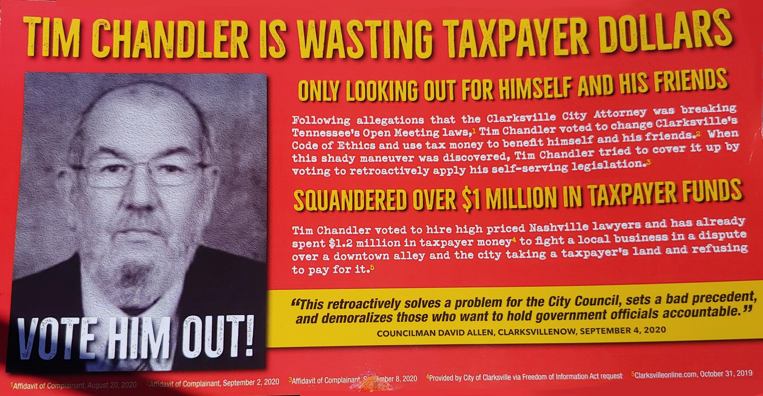 “Tim Chandler voted to hire high-priced Nashville lawyers and has already spent $1.2 million in taxpayer money to fight a local business in a dispute over a downtown alley,” says the mailer.