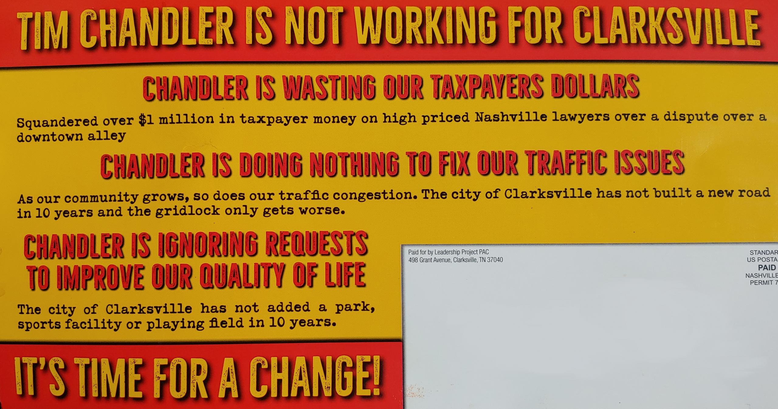 The mailer makes several allegations against Chandler, claiming he has done little to address traffic issues, has ignored requests to build and improve parks and recreation facilities and has squandered taxpayer dollars.