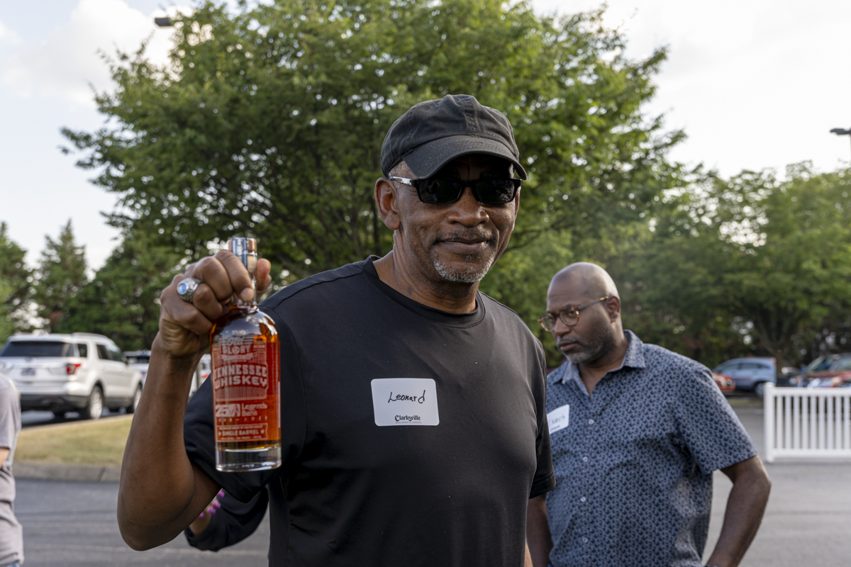 Mr. Leonard Tharpe with his door prize courtesy of Old Glory Distillery at the Clarksville Chamber of Commerce Business After Hours on June 20, 2024. (Jeff Danault)