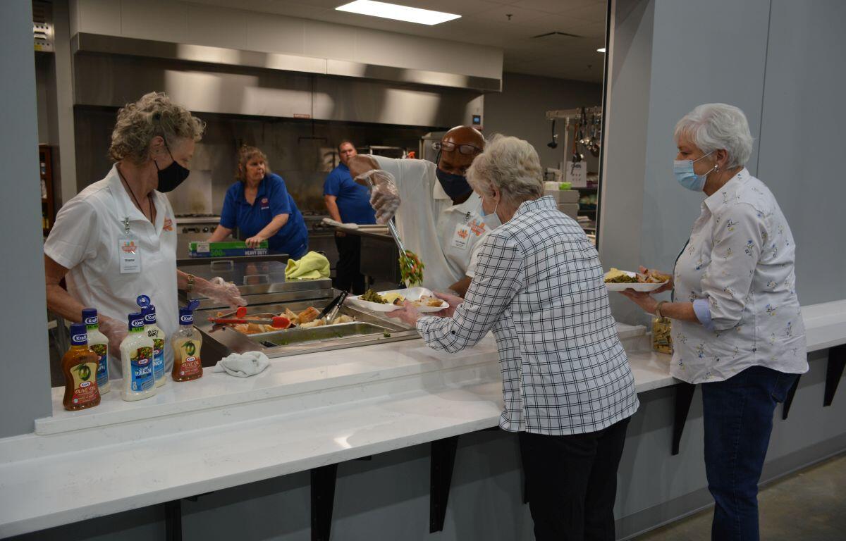 Members of North Meets South and a Loaves and Fishes Board Member serve a meal at the Loaves and Fishes volunteer dinner on Fri., September 24 2021 (Lee Erwin).