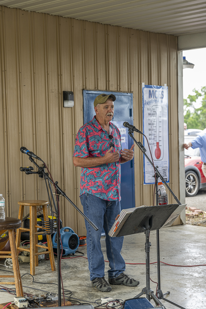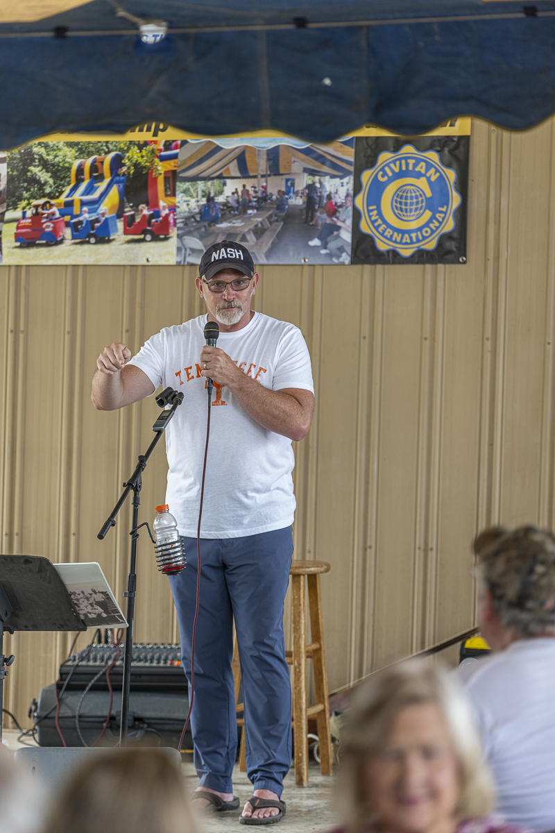 Larry Pitts with the opening remarks and introductions of speakers at the Annual Lone Oak Picnic. July 27, 2024. (Jeff Danault)