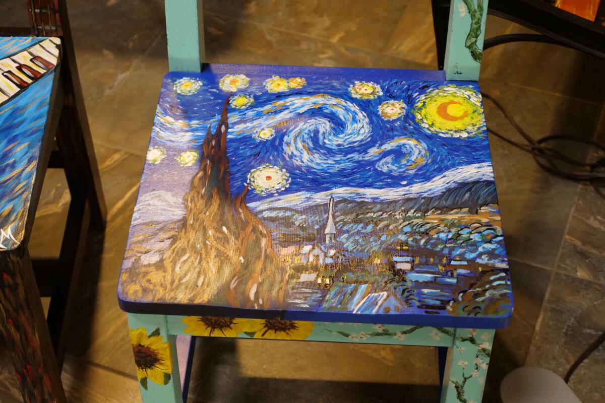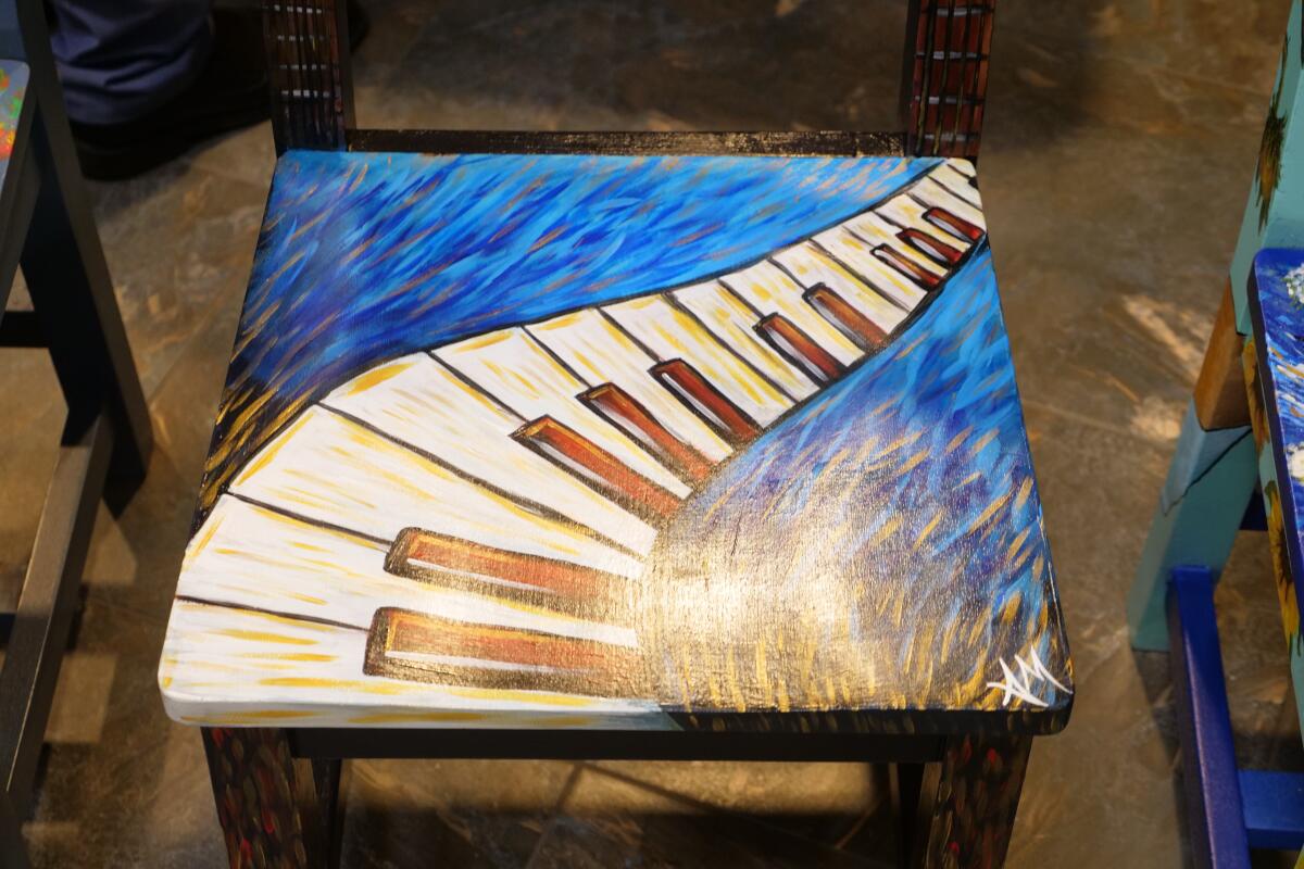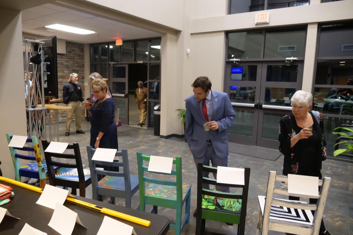 Artist-painted chairs for auction at Manna Cafe’s Golden Gala fundraiser on Nov. 4, 2022. (Jim Key)