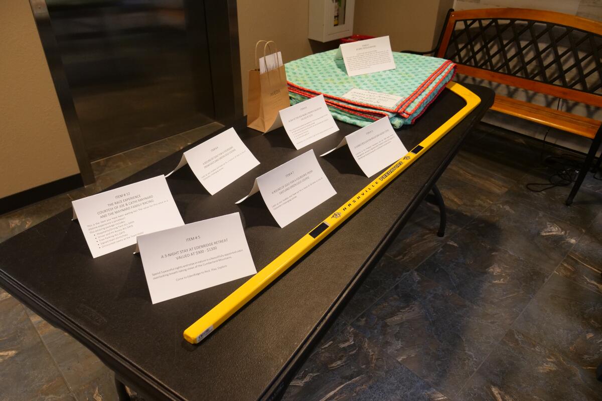 Auction items, including a Predators hockey stick and a quilt, at Manna Cafe’s Golden Gala fundraiser on Nov. 4, 2022. (Jim Key)