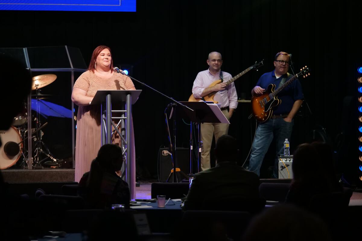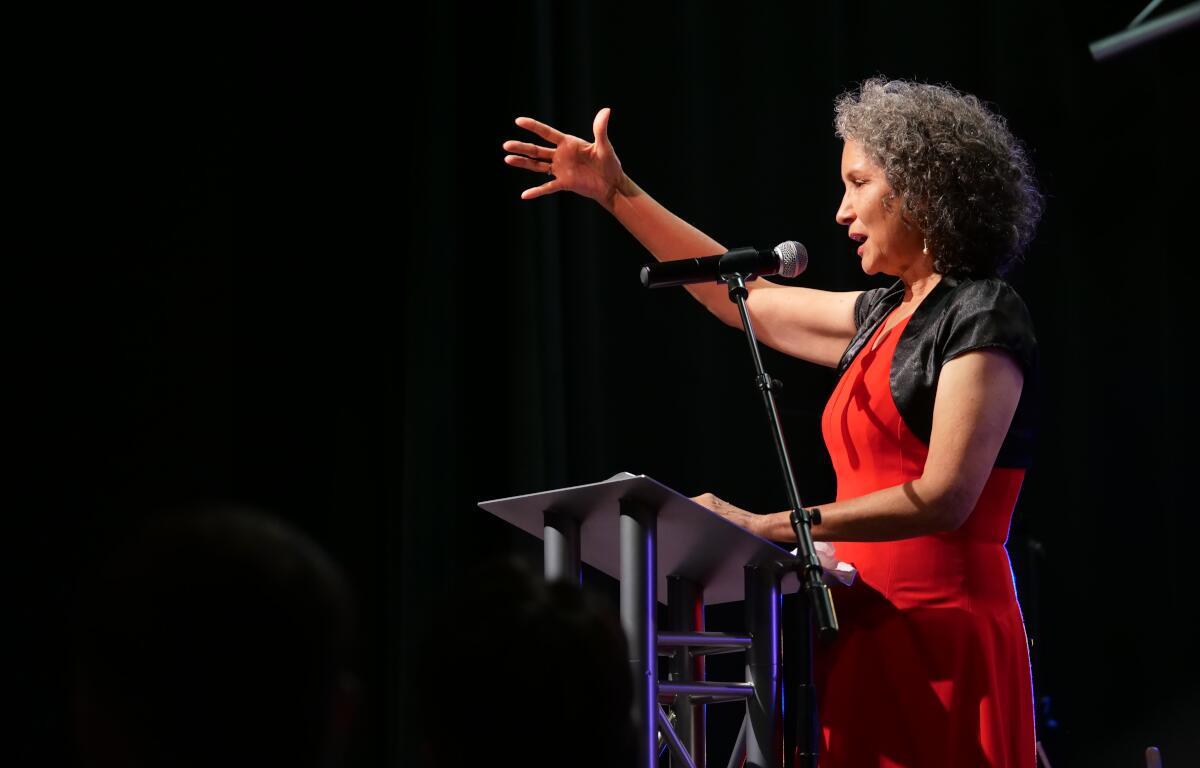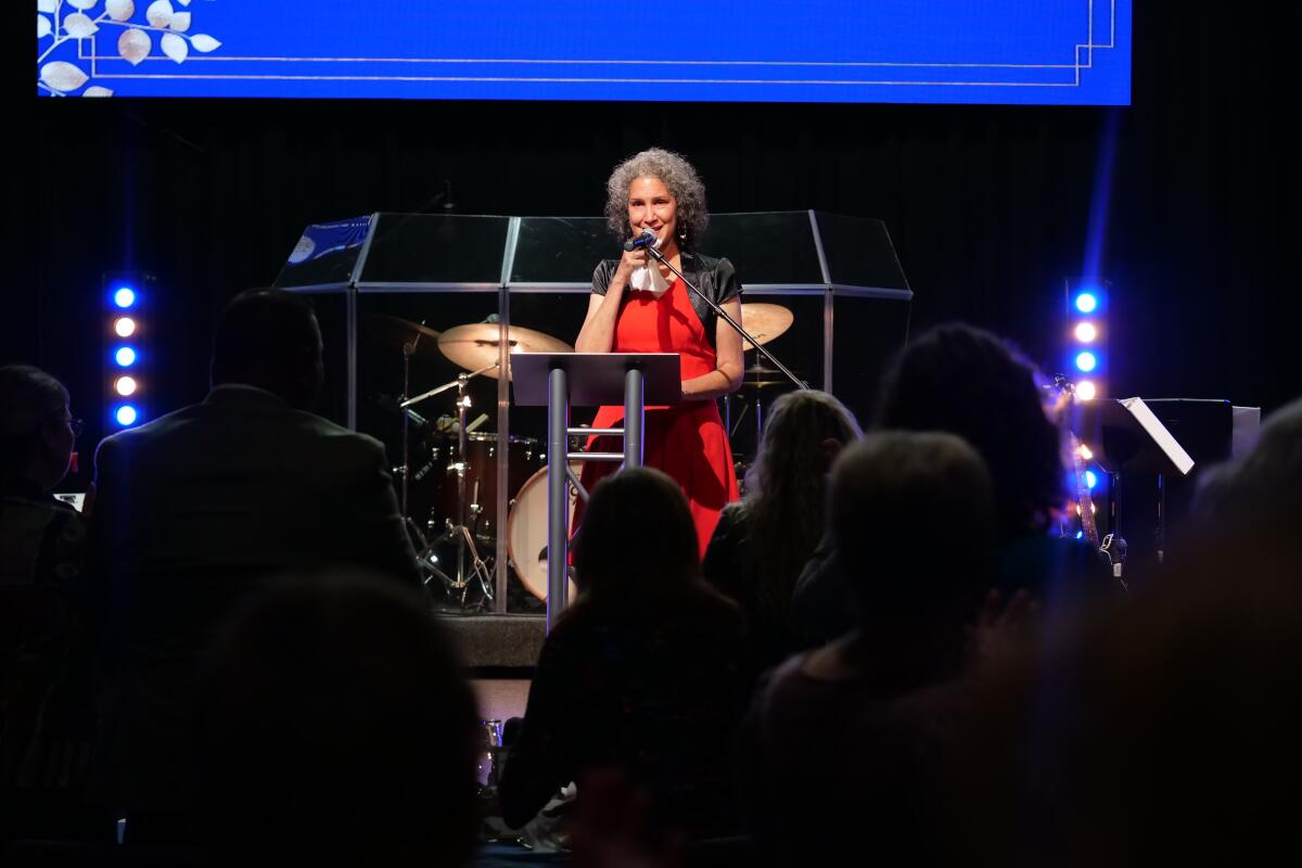 Sara Golden leads the blessing of the food at Manna Cafe’s Golden Gala fundraiser on Nov. 4, 2022. (Jim Key)