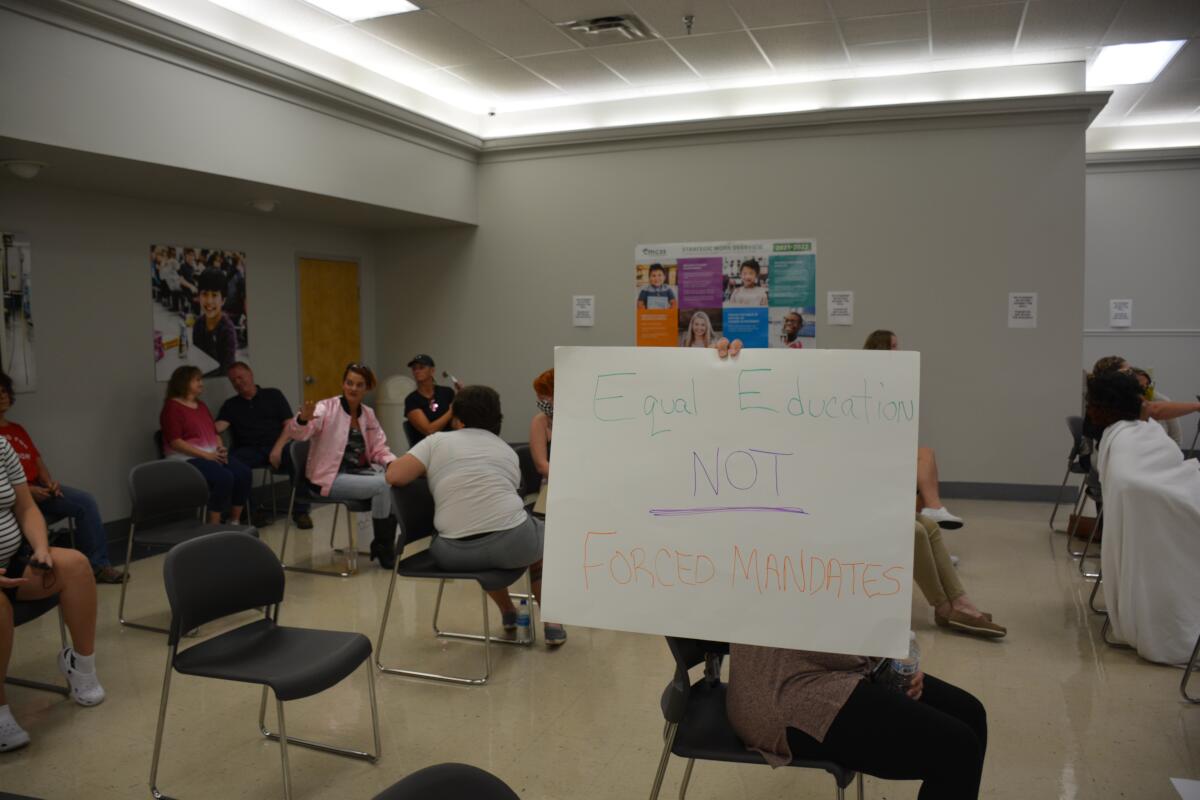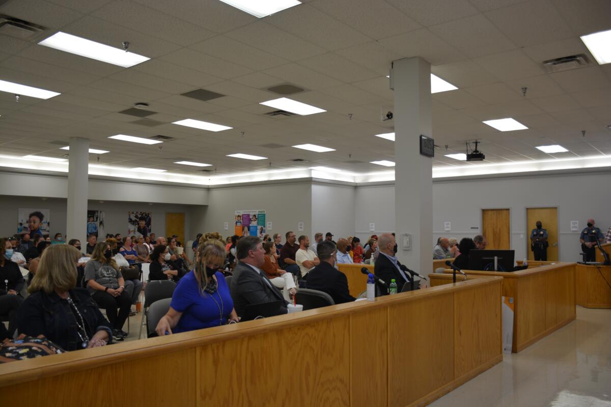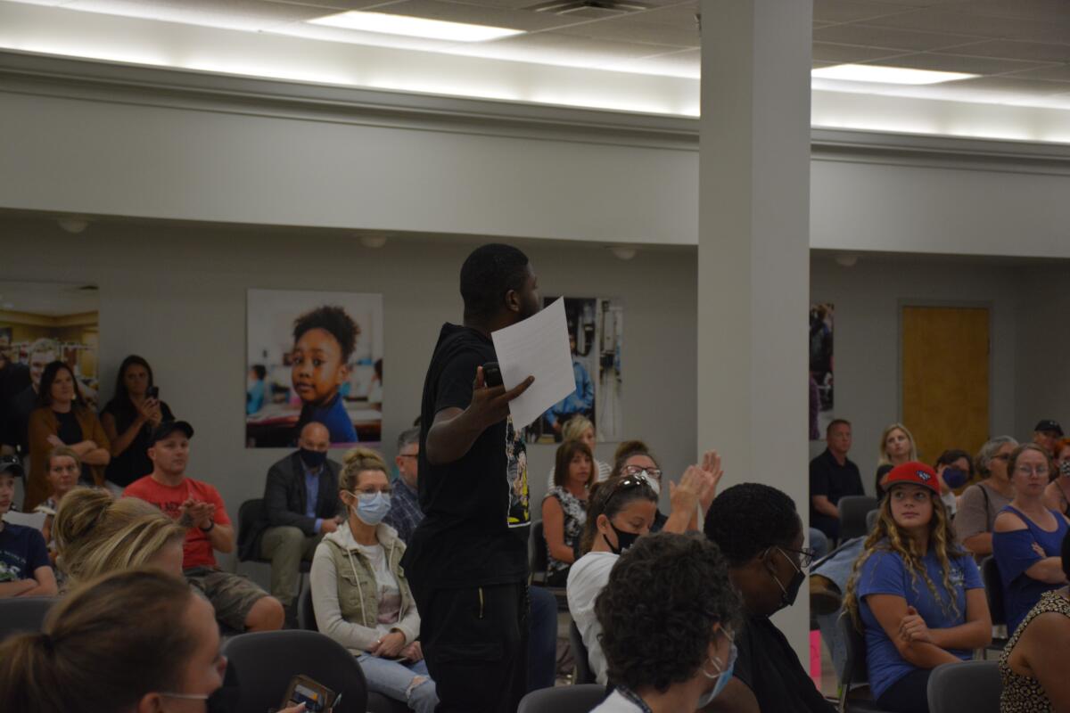 About 350 parents, students and CMCSS staff members attended the meeting, with 190 allowed in the main board room and 65 allowed in the meeting’s overflow room. Others were turned away once the meeting reached capacity, resulting in tense exchanges in the Central Services parking lot.