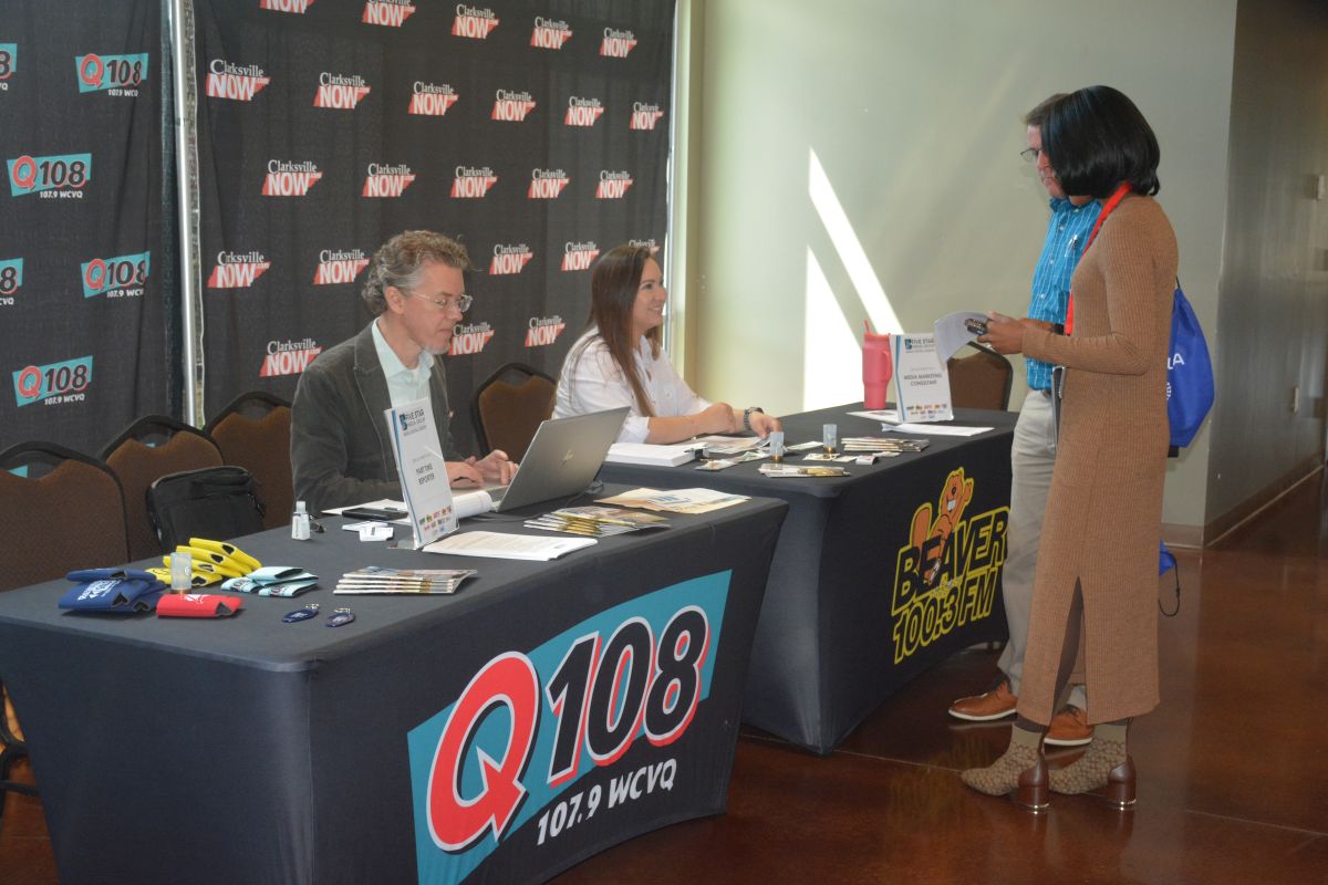 Chris Smith of Clarksville Now and Rachel Coffelt at the 5th Annual Mega Job Fair, which continues Wednesday after its first day Tuesday on Aug. 15, 2023. (Lee Erwin)