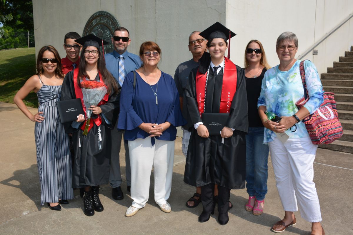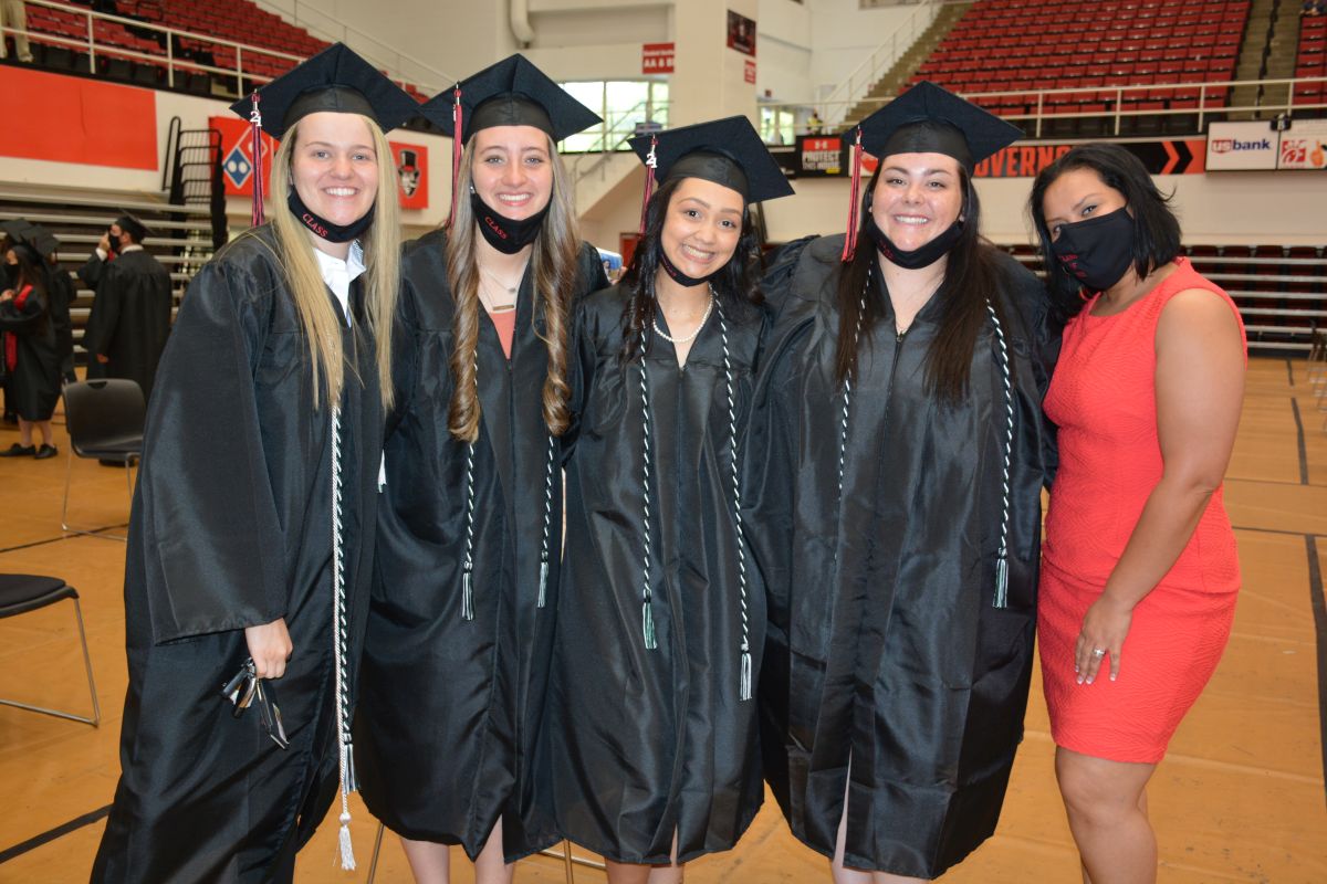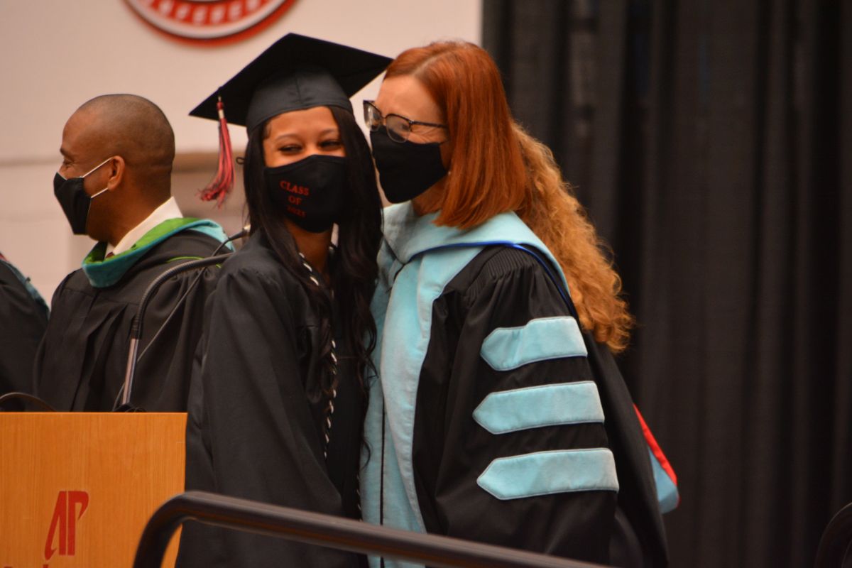 As the student’s names were announced, each walked across the stage, paused for a graduation photo, and then moved their tassels from the right side of their caps to the left. They were joined by their families outside the Dunn Center for more congratulations and photos.