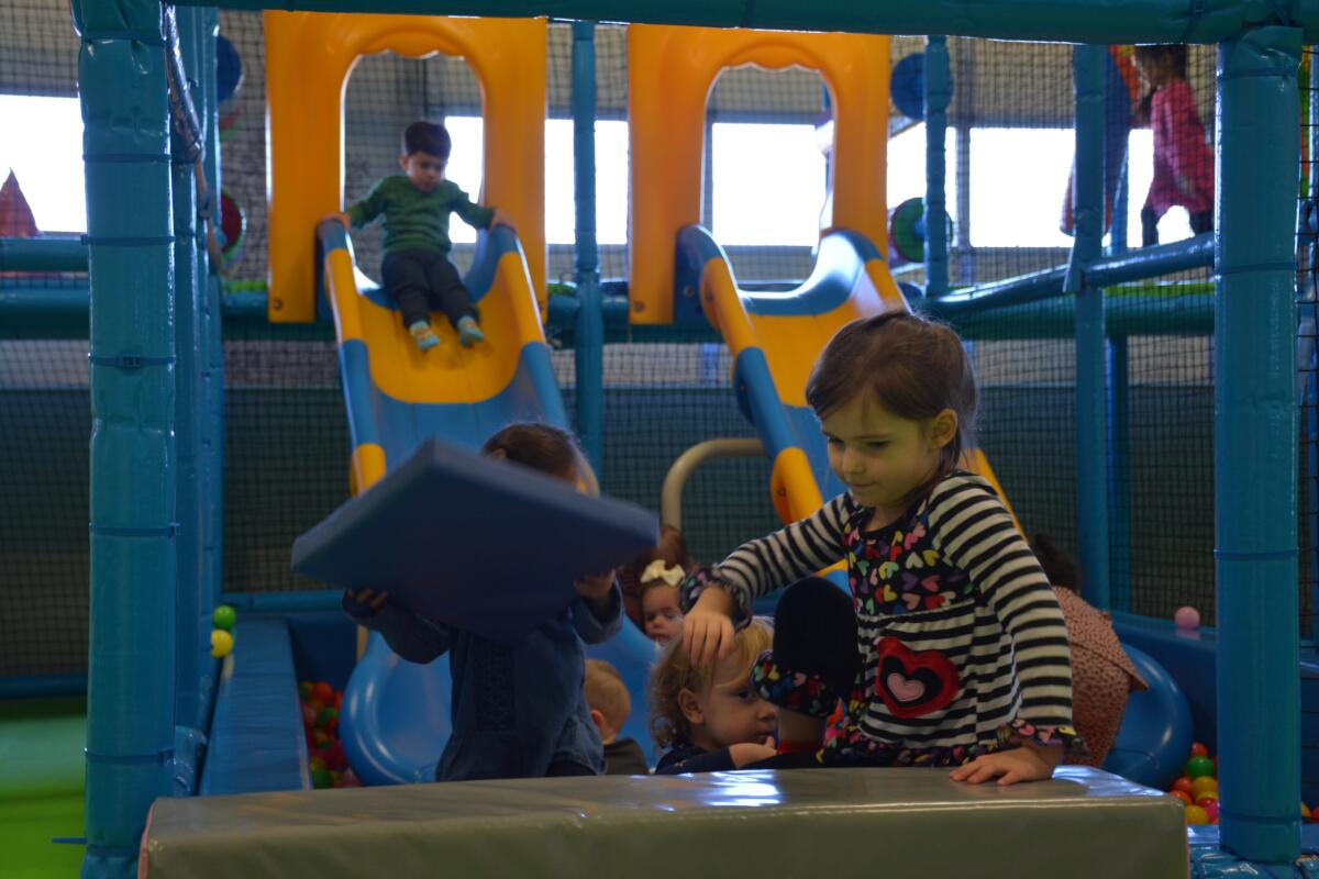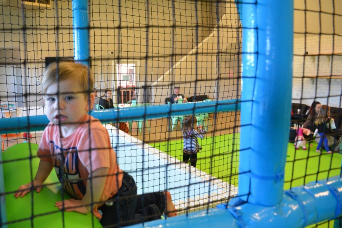 Through a second set of doors is a large indoor play area, complete with jungle gym, slides, play kitchen, a ball pit and toys. Parents can watch their kids have a good time while enjoying coffee with other parents.