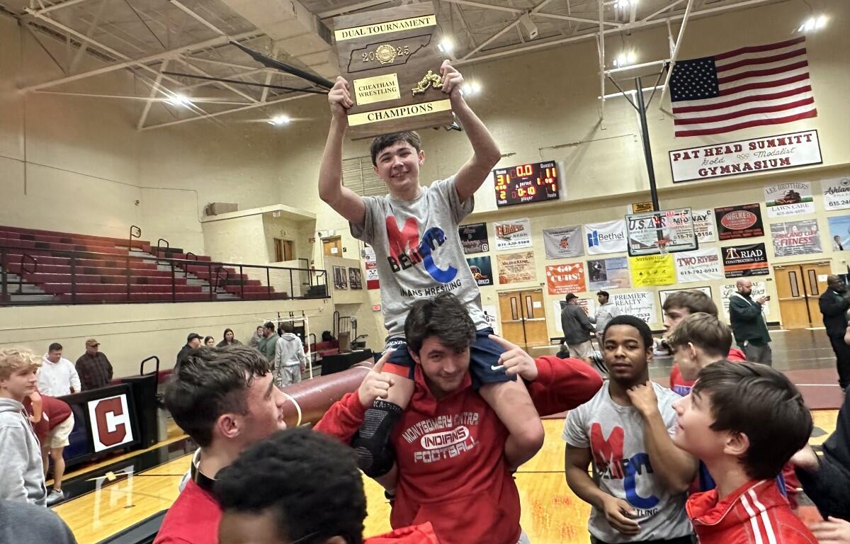 CLARKSVILLE, TN – For the second year in a row, the Montgomery Central High School varsity boys wrestling team is bringing home the championship plaque from Cheatham Duals. The Indians wrestled at Cheatham County High School on Saturday, defeating Greenbrier in the finals 47-33 for the title.