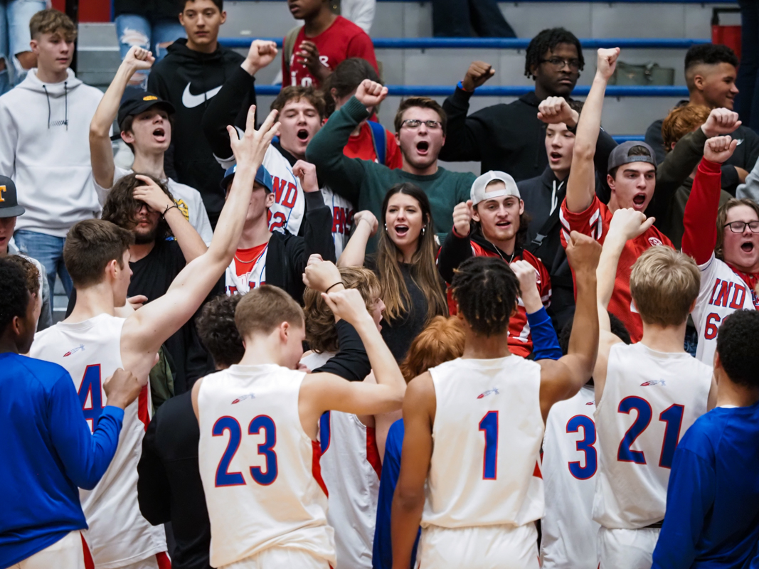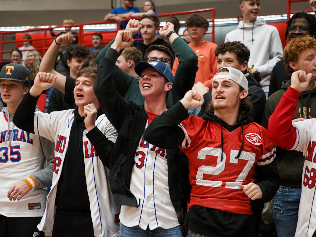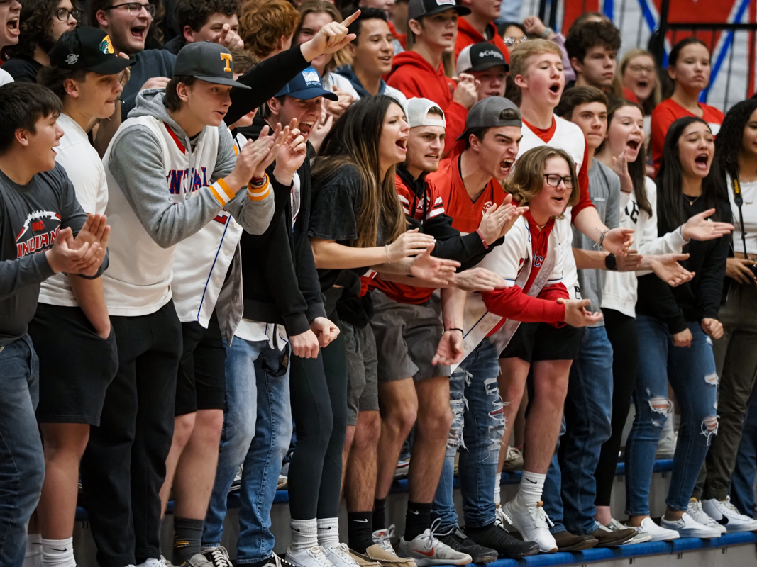 MCHS players and fans sing the alma mater Montgomery Central played Clarksville Christian School in boys basketball on Jan. 14, 2022. (Ryan Vinson)