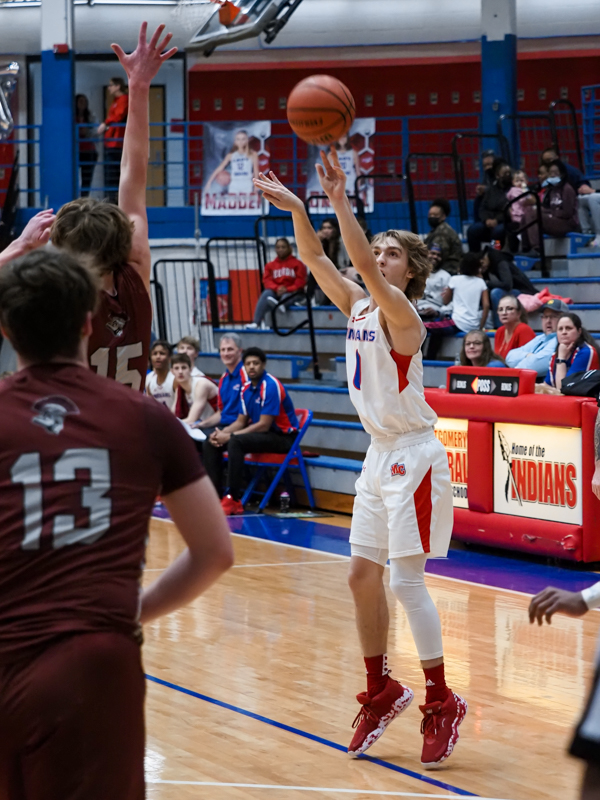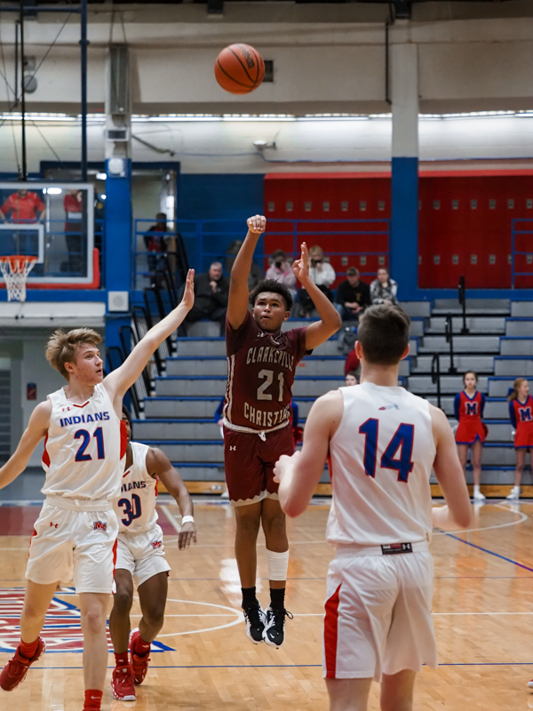 Caleb Lawton shooting as Montgomery Central played Clarksville Christian School in boys basketball on Jan. 14, 2022. (Ryan Vinson)