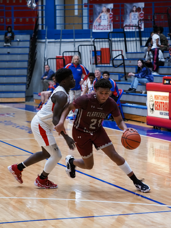 Michael Lawton driving as Montgomery Central played Clarksville Christian School in boys basketball on Jan. 14, 2022. (Ryan Vinson)