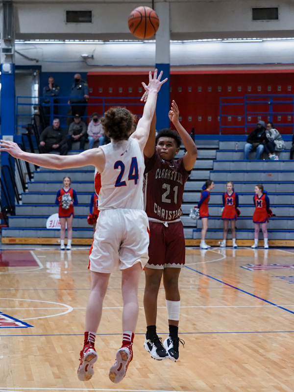 Eric Owen shooting as Montgomery Central played Clarksville Christian School in boys basketball on Jan. 14, 2022. (Ryan Vinson)